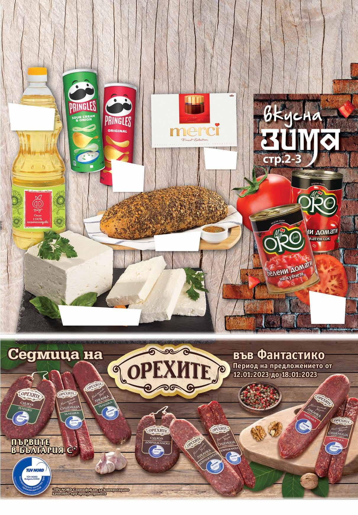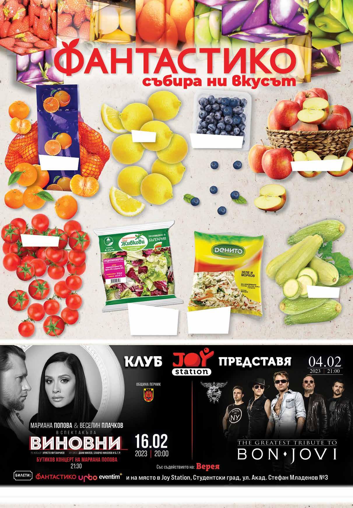 3 49 лв|бр 4.59 -23% 12.99 -23% 9 99 лв|бр 3.99 -27% 2 89 лв|бр 5.79 -25% 4 29 лв|бр 2.99 -33% 1 99 лв|бр 11.99 -25% 8 99 лв|кг 2.29 -21% 1 79 лв|бр 99 лв|кг 33.99 -26% 24 99 лв|кг 19.99 -25% 14 2.49 -32% 1 69 лв|бр Хумус SAPORI DEI MONASTERI различни видове 400 г Пилешка вешалица на скара Салата Снежанка КЕНАР 400 г Салата катък с печен пипер ВЕСЕЛИНА насипна от щандова витрина Печено пиле Руска салата с шунков колбас Ф ВКУС 400 г Пушен бекон на скара Пържени картофи стек хаус Панирани пилешки бон филенца с корнфлейкс Кетчуп Ф ВКУС класик туба 1 кг 11 ТВ „Фантастико” не носи отговорност за допуснати печатни грешки. Количествата са лимитирани! Предложенията са валидни до сряда 22.00ч. на 18.01.2023 г.