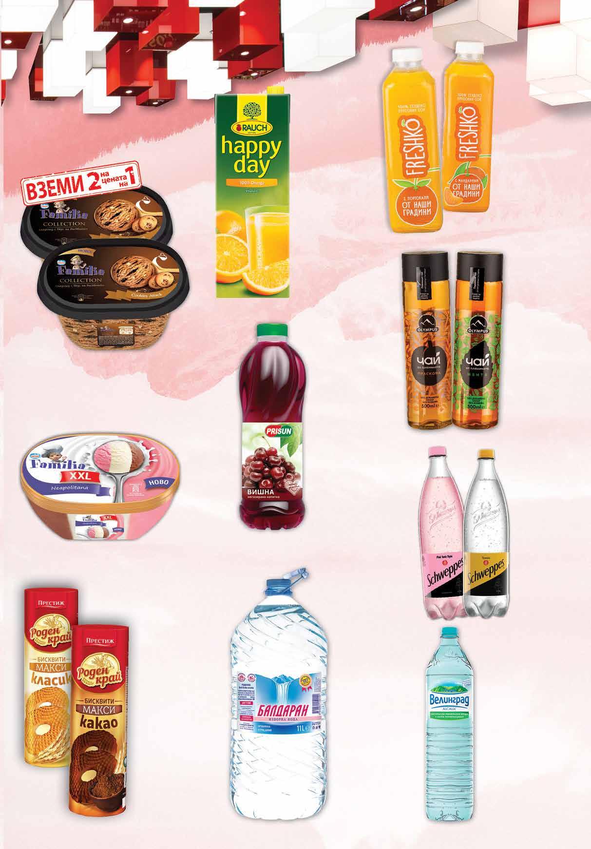 3.99 -30% 2 79 лв|бр 4.99 -20% 3 99 лв|бр 2.39 -25% 1 79 лв|бр 2.59 -23% 1 99 лв|бр 0.99 -30% 0 69 лв|бр 3.29 -45% 1 79 лв|бр 4.99 -30% 3 49 лв|бр 8.99 -27% 6 49 лв|бр 15.96 -50% 7 98 лв|2 бр 2.39 -29% 1 69 лв|бр Сок RAUCH HAPPY DAY 100% Портокал 1.5 л Сок FRESHKO различни видове PET, 1 л Плодова напитка PRISUN различни видове 2 л Студен чай OLYMPUS различни видове PET, 500 мл Газирана напитка SCHWEPPES различни видове 1,25 л Минерална вода ВЕЛИНГРАД PET, 1,5 л Изворна вода БАЛДАРАН 11 л Бисквити Роден край Макси различни видове 230-250 г Сладолед FAMILIA какао, бисквити и лешник; неаполитана 2 л Сладолед FAMILIA Collection различни видове 2* бр х 505-563 г * от един и същи вид 15 ТВ „Фантастико” не носи отговорност за допуснати печатни грешки. Количествата са лимитирани! Предложенията са валидни до сряда 22.00ч. на 18.01.2023 г.