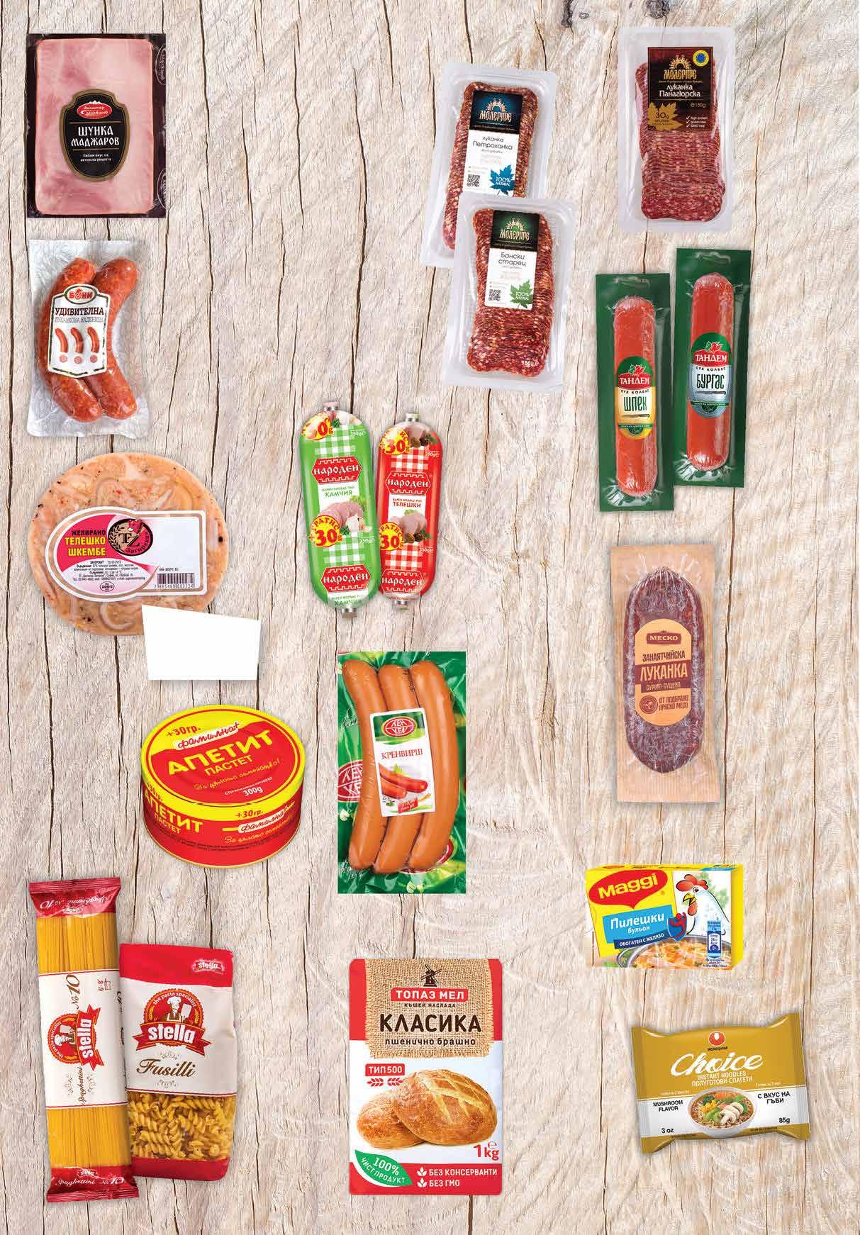 4.49 -24% 3 39 лв|бр 1.59 -25% 1 19 лв|бр 5.69 -22% 4 39 лв|бр 7.79 -29% 5 4 9 лв|бр 1.69 -23% 1 29 лв|бр 2.99 -26% 2 19 лв|бр 6.79 -26% 4 99 лв|бр 7.99 -25% 5 99 лв|бр 4.69 -31% 3 19 лв|бр 3.29 -33% 2 19 лв|бр 6.79 -26% 4 99 лв|бр бански старец 6.79 -26% 4 99 лв|бр петроханка 8.49 -29% 5 99 лв|бр ШПЕК 8.49 -29% 5 99 лв|бр БУРГАС 2.29 -26% 1 69 лв|бр 49 лв|кг 17.99 -25% 13 Кренвирши КЕН вакуум 320 г Шунка МАДЖАРОВ класик вакуум, 210 г Пшенично брашно ТОПАЗ МЕЛ Класика тип 500, 1 кг Бульон MAGGI 8 бр х 10 г, 80 г различни видове Луканкова наденица Удивителна БОНИ вакуум, 330 г Колбас ТАНДЕМ шпек; Бургас 230 г Спагети CHOICE полуготови 85 г различни вкусове Спагети №6; №10; Пене; Фусили; Кус-кус STELLA 500 г Колбас тип Камчия; тип Хамбургски; тип Телешки НАРОДЕН 320 г + 30 г Бански старец; Петроханка МОЛЕРИТЕ слайс вакуум, 150 г Луканка Панагюрска МОЛЕРИТЕ слайс, 150 г Луканка Занаятчийска МЕСКО вакуум, 190 г Телешко шкембе желирано вакуум ЦВЕТАНКА ЗАГОРСКА Пастет Апетит „ФАМИЛНА+“ 300 г 8 Продуктите се продават в количества, обичайни за едно домакинство. Декорацията към продуктите не е включена в тяхната цена. ТВ „Фантастико“ си запазва правото на промяна в цените.