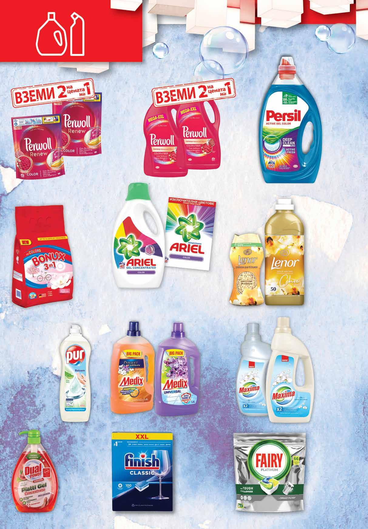 3 59 лв|бр 99 лв|oп. 19 98 лв|2 оп. 71.96 -50% 35 98 лв|2 бр 71.96 -50% 35 99 лв|бр 2 л 10 99 лв|бр 4 л 15 10.99 -45% 5 99 лв|бр омекотител 16.35 -45% 8 99 лв|бр перли 5 89 лв|бр 3 99 лв|бр 99 лв|оп. 17 2 49 лв|бр 99 лв|бр 29.79 -42% 16 99 лв|оп. 44.99 -37% 27 Препарат за съдове DUAL POWER помпа различни видове 1 л Омекотител SANO Маxima различни видове 2 л; 4 л Гел 1,65; 1,98; 2,2 л; Прах 2,6 кг; Капсули 22; 25; 28 бр за пране ARIEL различни видове Препарат за под MEDIX различни видове 1,4 л Гел 3 л; Капсули 40 бр в опаковка; Прах 3.3 кг за пране PERSIL Препарат за съдове PUR 750 мл различни видове Капсули за пране PERWOLL Renew различни видове 2* oп. х 42 бр *от един и същи вид Препарат за пране PERWOLL Renew различни видове 2* бр. х 4,05 л *от един и същи вид Таблетки за съдомиялна FAIRY All in one 84 бр в пакет; Platinum Plus 50 бр в опаковка; Platinum 66 бр в опаковка Прах 2 кг; Гел 1,1 л; за пране BONUX различни видове Омекотител 1,4 л; 1,5 л Ароматизиращи перли 210 г LENOR различни видове Таблетки за съдомиялна машина FINISH Classic 100 бр в опаковка 22 Продуктите се продават в количества, обичайни за едно домакинство. Декорацията към продуктите не е включена в тяхната цена. ТВ „Фантастико“ си запазва правото на промяна в цените.