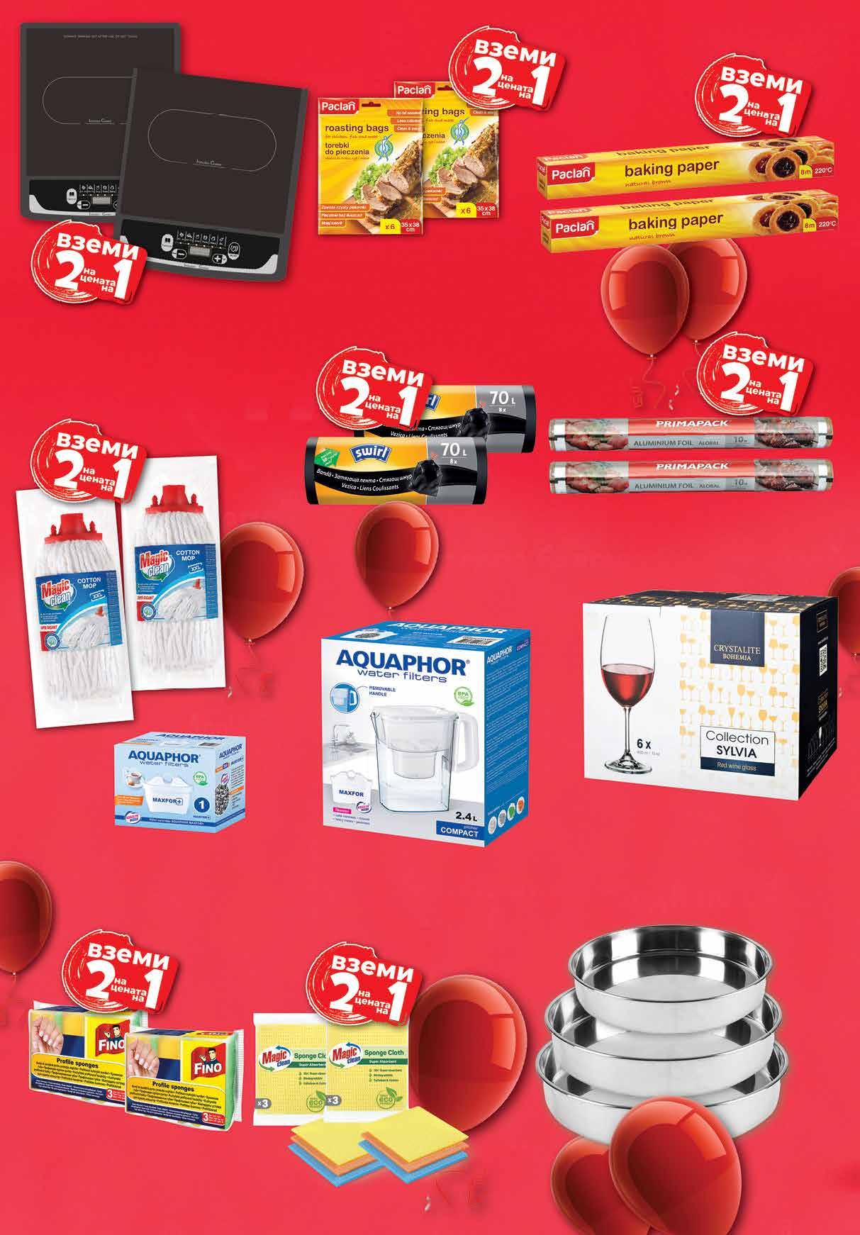 12.99 -50% 6 49 лв|бр Ø34см 11.99 -50% 5 99 лв|бр Ø30см 8.99 -50% 4 49 лв|бр Ø26см 98 лв|2 бр 151.96 -50% 75 6.36 -50% 3 18 лв|2 оп. 7.16 -50% 3 58 лв|2 бр 5.96 -50% 2 98 лв|2 оп. 14.99 -50% 7 49 лв|бр 9.36 -50% 4 68 лв|2 оп. 6.96 -50% 3 48 лв|2 оп. 2.96 -50% 1 48 лв|2 оп. 8.68 -50% 4 34 лв|2 оп. 99 лв|бр 25.99 -50% 12 99 лв|к-т 450 мл 33.99 -50% 16 99 лв|к-т 350 мл 32.59 -47% 16 Тава BRIO от неръждаема стомана Ø34 см; Ø30 см; Ø26 см Индукционен котлон 200W, 2 бр • oхлаждащ вентилатор; • терморегулатор; • 4-цифрен лед дисплей. Кана AQUAPHOR Компакт 2.4 л; филтрираща Комплект чаши за вино CRISTALINE BOHEMIA Colection Sylvia 350 мл; 450 мл 6 бр в опаковка Бърсалка за под MAGIC CLEAN въже XXL, 2 бр Пликове за печене PACLAN 35x 38 см 2 оп. х 6 бр в опаковка Хартия за печене PACLAN кафява 2 оп. х 8 м Попивателна кърпа MAGIC CLEAN размер М биоразградима 2оп. х 3 бр в опаковка Домакинска гъба с канал FINO 2 оп х 3 бр в опаковка Торби за смет SWIRL 70 л, 2 оп. х 8 бр Алуминиево фолио PRIMAPACK 2 оп. х 10м х 29см Филтър AQUAPHOR Maxfor Plus; Maxfor Plus Mg; Maxfor Plus H 1 бр 20 Продуктите се продават в количества, обичайни за едно домакинство. Декорацията към продуктите не е включена в тяхната цена. ТВ „Фантастико“ си запазва правото на промяна в цените.