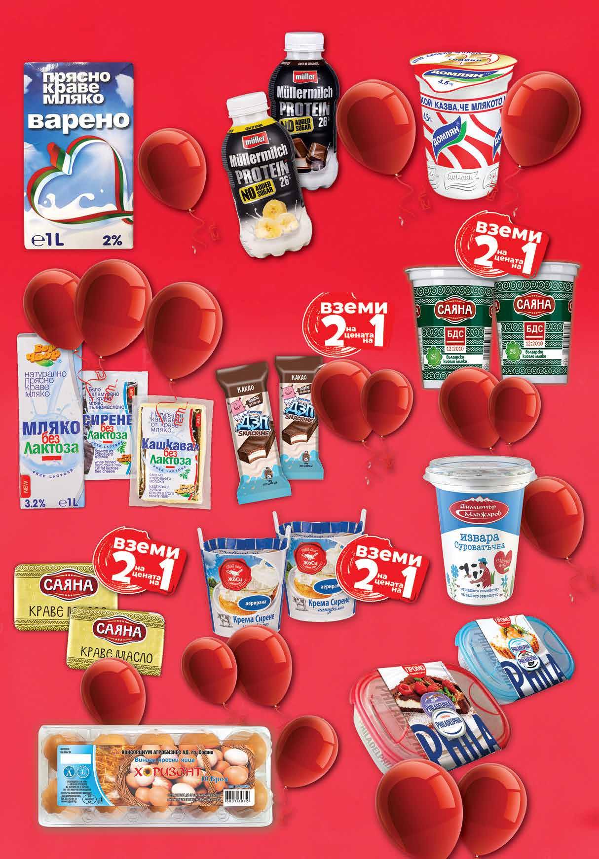 6.76 -50% 3 38 лв|2 бр 1.85 -27% 1 35 лв|бр 3.99 -40% 2 39 лв|бр 3.99 -50% 1 99 лв|бр 2.39 -25% 1 79 лв|бр 3.99 -25% 2 99 лв|бр 2.88 -50% 1 44 лв|2 бр 2.32 -50% 1 16 лв|2 бр 7.56 -50% 3 78 лв|2 бр 7 39 лв|k-t протеин 7 39 лв|k-t оригинал Кисело мляко САЯНА масленост 2% по БДС 2 бр х 400 г Десерт ДЗП какао; мляко и мед 2* бр х 30 г *от един и същи вид Краве масло САЯНА 2 бр х 125 г Крема сирене натурална аерирана ЖОСИ 2 бр х 150 г Кисело мляко ДОМЛЯН масленост 4,5% 500 г Протеиновa напитка без захар MULLER банан; шоколад 400 г Извара МАДЖАРОВ суроватъчна 350 г Яйца ХОРИЗОНТ размер L 10 бр в кутия *предложението е валидно за магазините със сини цени Всички продукти без лактоза с марка БОР ЧВОР с -35% Прясно мляко ВАРЕНО масленост 2% 1 л отстъпка Комплект* сирене крем PHILADELPHIA оригинал и милка; протеин и лайт 2 бр х 175 г + подарък кутия *количествата са лимитирани 4 Продуктите се продават в количества, обичайни за едно домакинство. Декорацията към продуктите не е включена в тяхната цена. ТВ „Фантастико“ си запазва правото на промяна в цените.