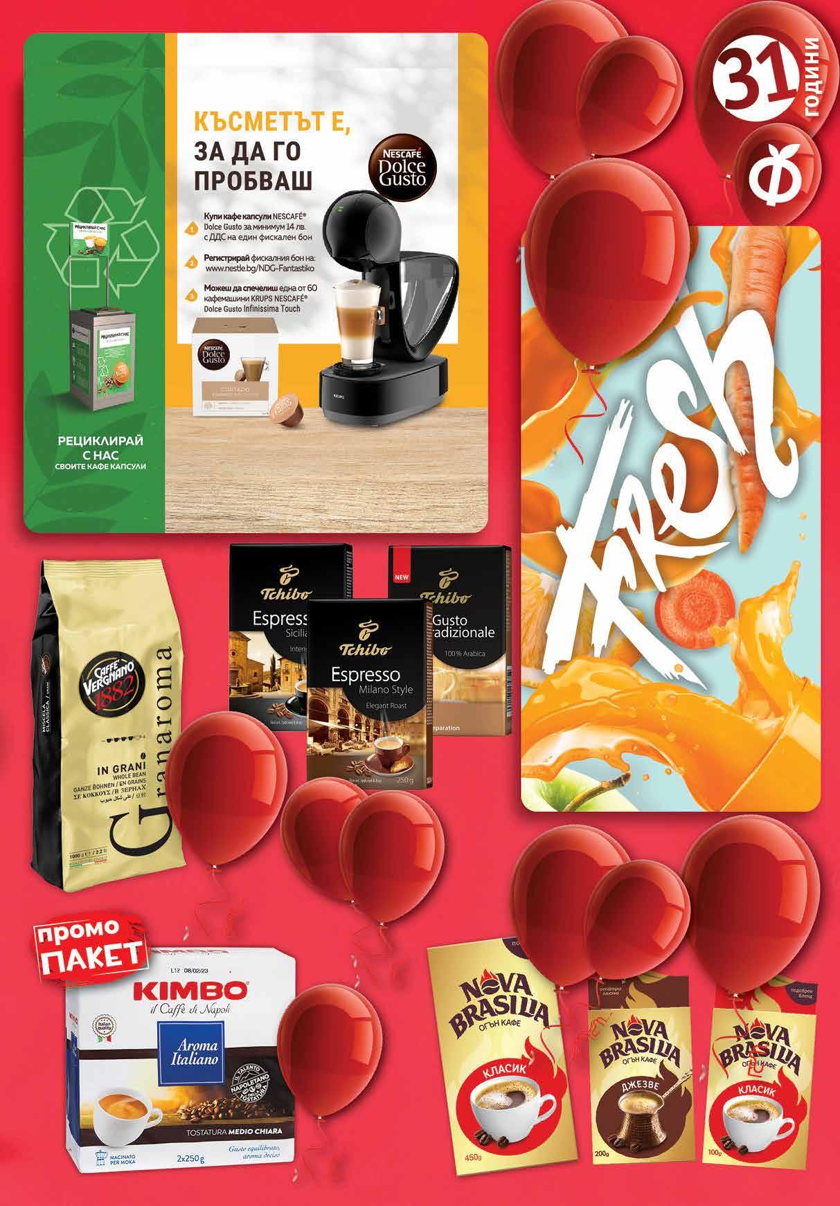 11.99 -50% 5 89 лв|бр 11.99 -50% 5 89 лв|бр gusto 15.98 -50% 7 89 лв|k-t 99 лв|бр 49.99 -50% 24 Купи кафе капсули NESCAFÉ® Dolce Gusto за минимум 14 лв. с ДДС на един фискален бон. Регистрирай фискалния бон на уебсайт: www.nestle.bg/NDG-Fantastiko и може да спечелиш една от 60 кафемашини Krups NESCAFÉ® Dolce Gusto Infinissima Тouch. С един фискален бон може да се участва само веднъж. Трябва да запазиш фискалния бон, за да удостовериш покупката. Печелившите и пълните правила на играта ще бъдат публикувани на адрес: www.nestle.bg/NDG-Fantastiko. Промоцията се организира от „Нестле България“ АД в Търговска верига „Фантастико“ и е валидна за период от 03.11.2022г. до 09.11.2022г. *Изображенията са с илюстративна цел. **ТВ „Фантастико” не носи отговорност за законосъобразността на играта и нейното провеждане. Фреш портокал, ябълка и морков с отстъпка -35% *предложението е валидно за магазините със сини цени Мляно кафе TCHIBO Espresso Milano Style; Espresso Sicillia Style; Gusto Tradizionale 250 г Комплект мляно кафе KIMBO Italiano 2 бр х 250 г отстъпка минимум -20% Кафе на зърна VERGNANO GRANAROMA 1кг отстъпка минимум -28% Всички видове кафе с марка NOVA BRASILIA с Всички видове капсули НЕСКАФЕ DOLCE GUSTO с 13ТВ „Фантастико” не носи отговорност за допуснати печатни грешки. Количествата са лимитирани! Предложенията са валидни до сряда 22.00ч. на 09.11.2022 г.