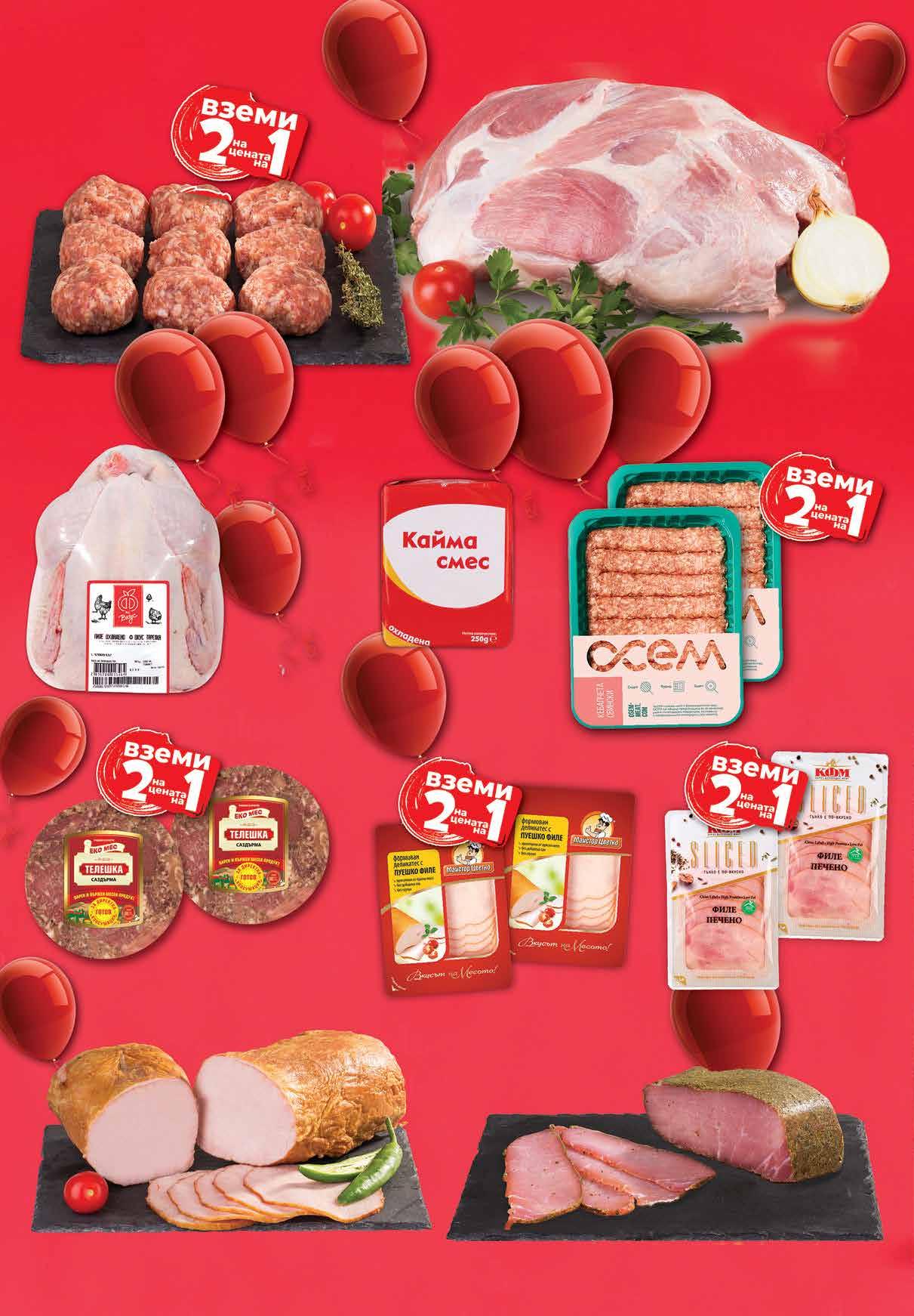 7.99 -37% 4 99 лв|кг 1.45 -40% 0 87 лв|бр 12.96 -50% 6 48 лв|2 бр 8.96 -50% 4 48 лв|2 бр 9.96 -50% 4 98 лв|2бр 12.96 -50% 6 48 лв|2 бр 13.99 -40% 8 39 лв|кг 1.96 -50% 0 98 лв|2 бр 6 99 лв|кг 79 лв|кг 38.99 -41% 22 Кайма смес охладена пакетче 250 г БЕЛЛА Пиле охладено Ф ВКУС тарелка Кебапчета свински ОСЕМ тарелка, 2бр х 480 г Сурови кюфтета насипни от щандова витрина 2 бр х 70 г, СММ Телешка саздърма ЕКО МЕС вакуум 2 бр х 180 г Деликатес с пуешко филе МАЙСТОР ЦВЕТКО слайс, вакуум 2 бр х 100 г Свинско филе варено-пушено МИТИ насипно от щандова витрина Тракийско филе СТАРСКО насипно от щандова витрина Свинска плешка без кост охладена, насипна от щандова витрина* *Цената не важи за предварително опаковано месо Свинско филе печено КФМ слайс, 2 бр х 80 г 6 Продуктите се продават в количества, обичайни за едно домакинство. Декорацията към продуктите не е включена в тяхната цена. ТВ „Фантастико“ си запазва правото на промяна в цените.