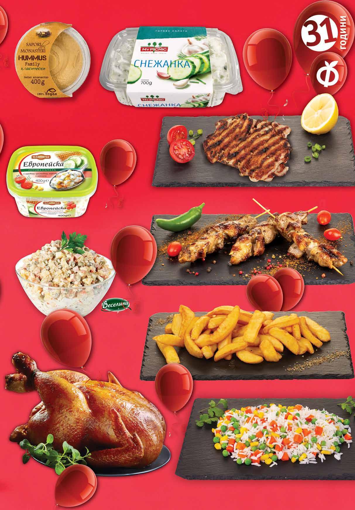 15.99 -50% 7 99 лв|кг 12.99 -38% 7 99 лв|бр 2.39 -50% 1 19 лв|бр 7.99 -50% 3 99 лв|кг 3.19 -47% 1 69 лв|бр 4.59 -34% 2 99 лв|бр 2 75 лв|бр 4.59 -40% 3.79 -30% 2 65 лв|бр 8.90 -40% 5 30 лв|кг Печено свинско шишче Пържени картофи стек хаус Хумус SAPORI DEI MONASTERI различни видове 400 г Салата Снежанка MY PICNIC 700 г Руска салата ВЕСЕЛИНА насипна от щандова витрина Печена пилешка пържола от бут Ориз със зеленчуци Салата Европейска ОЛИНЕЗА 400 г Печено пиле 11ТВ „Фантастико” не носи отговорност за допуснати печатни грешки. Количествата са лимитирани! Предложенията са валидни до сряда 22.00ч. на 09.11.2022 г.