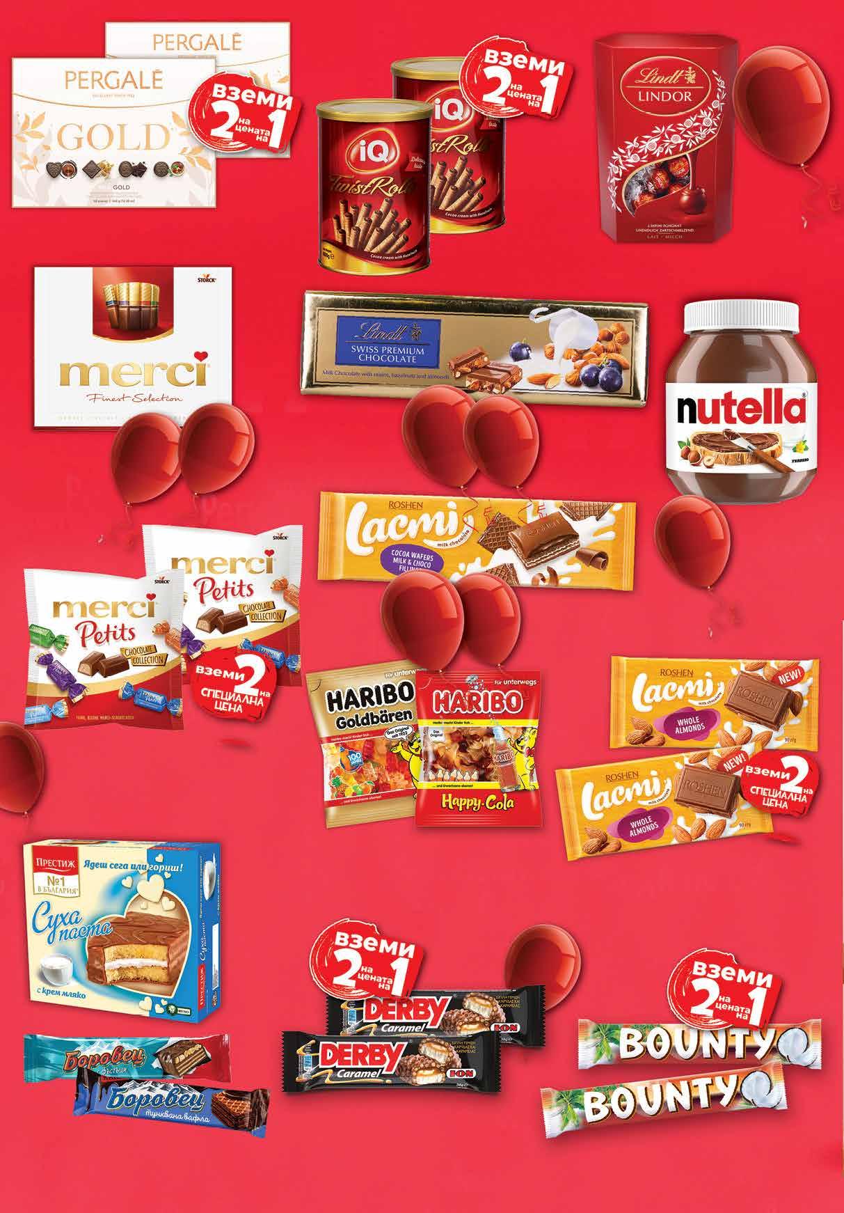 3.16 -50% 1 58 лв|2 бр 17.96 -50% 8 98 лв|2 бр 10.58 -33% 6 99 лв|2 бр 2.08 -50% 1 04 лв|2 бр 4.38 -38% 2 70 лв|2 бр 16.96 -50% 8 48 лв|2 бр 1.99 -30% 1 39 лв|бр 5.49 -36% 3 49 лв|бр 11.99 -35% 7 69 лв|бр 0.69 -39% 0 42 лв|бр 11.99 -34% 7 89 лв|бр 12.99 -31% 8 89 лв|бр 4.59 -41% 2 69 лв|бр 9.49 -26% 6 99 лв|бр Какаов крем NUTELLA 700 г Шоколад LACMI различни видове 265-290 г Бонбони MERCI различни видове 250 г Шоколад LINDT Gold лешници и стафиди 300 г Бонбони LINDT Lindor различни видове 200 г Вафлa БОРОВЕЦ фъстъци, какао дарк 45 г Желирани бонбони HARIBO Златни мечета; Хепи кола 100г Суха паста ПРЕСТИЖ различни видове 300 г Вафлени пурички IQ 2 бр х 400 г Десерт DERBY шоколад с карамел; оризов крисп и кокос 2* бр х 38 г *от един и същи вид Бонбони PERGALE GOLD 2 бр х 348 г 5.29 лв + 5.29 лв = Бонбони MERCI PETITS различни видове 2* бр х 125 г *от един и същи вид Шоколад ROSHEN Lacmi бадем; лешник 2* бр х 90 г *от един и същи вид 2,19 + ,2,19 = Десерт BOUNTY Dark 2 бр х 57 г 14 Продуктите се продават в количества, обичайни за едно домакинство. Декорацията към продуктите не е включена в тяхната цена. ТВ „Фантастико“ си запазва правото на промяна в цените.
