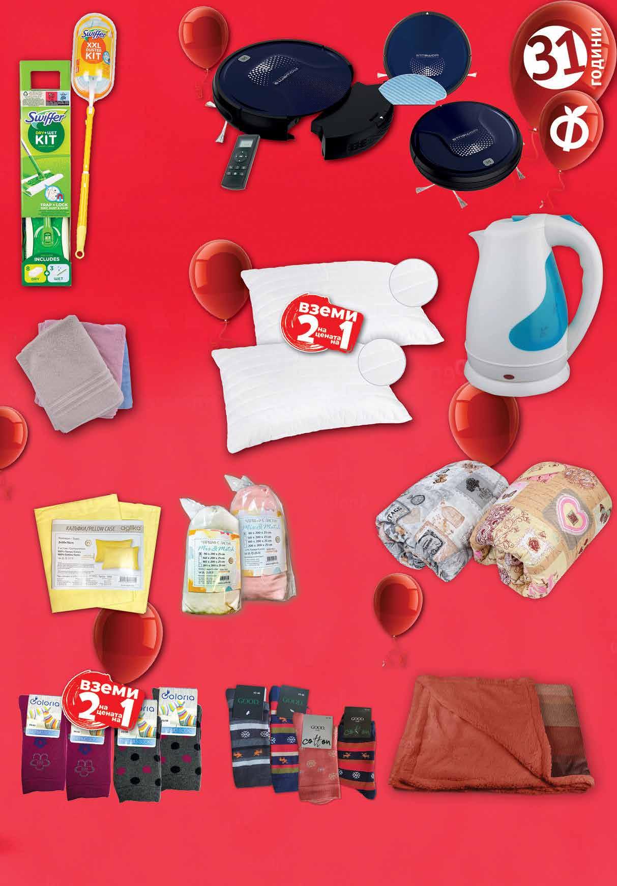 19.99 -50% 9 99 лв|бр 70х140 9.99 -50% 4 99 лв|бр 50х90 3.69 -51% 1 79 лв|бр 30х50 3.49 -50% 1 74 лв|бр 7.96 -50% 3 98 лв|2 чифта 98 лв|2 бр 33.96 -50% 16 49 лв|бр 200/210 34.99 -50% 17 49 лв|бр 150/210 28.99 -50% 14 99 лв|бр 26.99 -37% 16 11.99 -41% 6 99 лв|к-т 13.99 -28% 9 99 лв|к-т за прах 99 лв|к-т МОП 29.99 -33% 19 99 лв|бр 200/200 38.69 -37% 23 99 лв|бр 160/200 32.99 -33% 21 99 лв|бр 90/200 22.89 -38% 13 99 лв|бр 140x200 49.99 -50% 24 99 лв|бр 200x220 69.99 -50% 34 Комплект калъфки за възглавница AGLIKA 50х70 см, 2 бр Прахосмукачка робот RR6871WH • 3 режима на работа; • Функция моп; • Система разпознаване на стълби; • Задаване на график; • Работа до 150 мин. Комплект за прах XXL 1 четка + 2 резервни кърпи Комплект моп 1 дръжка, 8 кърпи, 3 мокри кърпи SWIFFER Електрическа кана 1800W Чаршаф с ластик AGLIKA памук/сатен 90/200см; 160/200см; 200/200см различни цветове Хавлиена кърпа асорти различни цветове 30х50 см; 50х90 см; 70х140 см Одеяло Шерпа Нептун 140х200 см; 200х220 см Термо чорапи GOOD зима №35-38 детски; №39-42 дамски; №43-46 мъжки Термо чорапи COLORIA размери №35-41 дамски, 2* чифта различни десени *от един и същи десен Възглавница New Daily 2 бр х 45х65 см Олекотена завивка с щампа 150/210 см; 200/210 см 100% ПЕ-200гр/м2 499.99 -40% 299 99 лв|бр 21ТВ „Фантастико” не носи отговорност за допуснати печатни грешки. Количествата са лимитирани! Предложенията са валидни до сряда 22.00ч. на 09.11.2022 г.