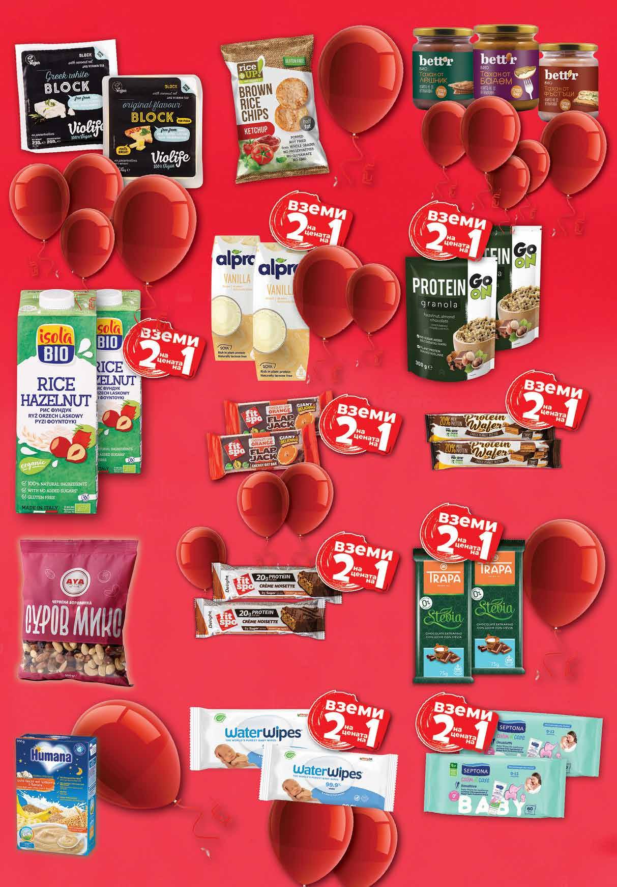 1.85 -41% 1 09 лв|бр 8.39 -34% 5 49 лв|бр 13.16 -50% 6 58 лв|2 бр 5.12 -50% 2 56 лв|2 бр 5.16 -50% 2 58 лв|2 бр 5.56 -50% 2 78 лв|2 бр 16.99 -50% 8 49 лв|бр 7.36 -50% 3 68 лв|2 бр 13.96 -50% 6 98 лв|2 бр 5.96 -50% 2 98 лв|2 бр 15.36 -50% 7 68 лв|2 бр 7.68 -50% 3 84 лв|2 oп. Оризов чипс RICE UP морска сол; кисели краставички и копър; кетчуп 60 г Био тахан BETT‘R фъстъчен, бадем, лешник, крем от лешник без захар, ягода и кашу без захар, кашу и лешници без захар от 250 г с отстъпка -31% Протеинова гранола SANTE GO ON шоколад, лешници и бадем 2 бр х 300 г *предложението е валидно за магазините със сини цени минимум Избрани веган продукти с марка VIOLIFE с отстъпка минимум -25%*акцията е валидна за магазините със сини цени Каша HUMANA пълнозърнеста с банан; бисквити и 5 зърна; банан и 5 зърна 200 г Шоколад със стевия TRAPA различни видове 2* бр х 75 г * от един и същи вид Био напитка ориз и лешник без глутен ISOLA BIO 2 бр х 1л Напитка ALPRO SOYA шоколад; ванилия; бадем 2* бр х 250 мл *от един и същи вид Протеинова вафла шоко фъстък 2 бр х 40 г Овесено блокче FIT SPO Flap Jack шоколад и портокал 2 бр х 100 г Протеинов бар FIT SPO крем ноазет 2 бр х 55 г Бебешки кърпички WATER WIPES различни видове 2* опаковки х 60 бр *от един и същи вид Бебешки кърпи SEPTONA Sensitive 0-12 м. 2 оп. х 60 бр в oпаковка Сурови ядки микс с червена боровинка АЯ 500 г 18 Продуктите се продават в количества, обичайни за едно домакинство. Декорацията към продуктите не е включена в тяхната цена. ТВ „Фантастико“ си запазва правото на промяна в цените.