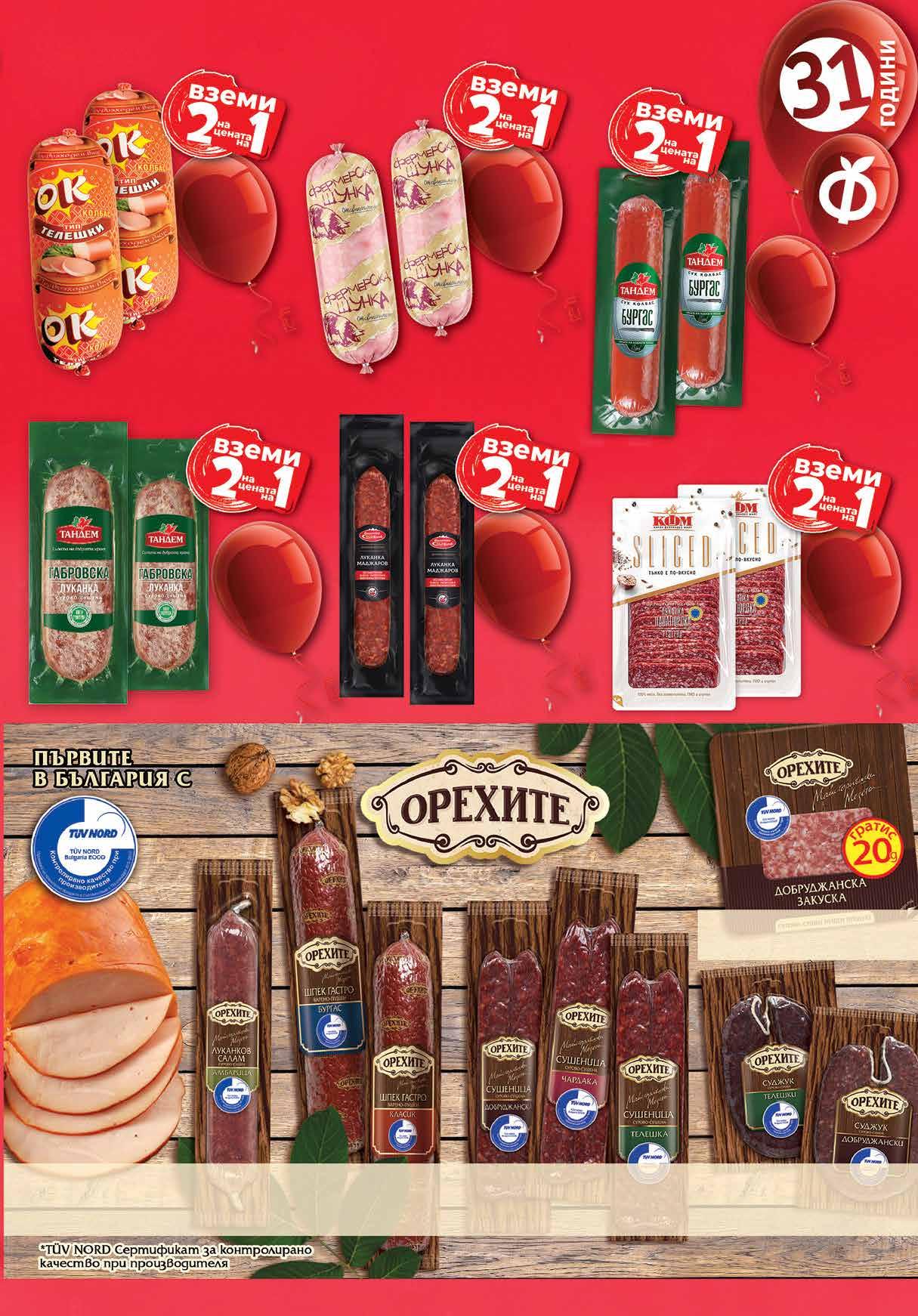 11.96 -50% 5 98 лв|2 бр 7.96 -50% 3 98 лв|2 бр 8.59 -36% 5 49 лв|бр 99 лв|кг 29.99 -33% 19 8.59 -36% 5 49 лв|бр телешка 9.99 -35% 6 49 лв|бр 5.49 -32% 3 69 лв|бр 15.96 -50% 7 98 лв|2 бр 11.96 -50% 5 98 лв|2 бр 17.96 -50% 8 98 лв|2 бр 15.96 -50% 7 98 лв|2 бр 7.99 -51% 3 89 лв|бр 99 лв|кг 24.99 -48% 12 Свинска шунка Фермерска ЖАР вакуум, 2 бр х 300 г Колбас тип телешки ОК вакуум 2 бр х 700 г Сушеница ОРЕХИТЕ Добруджанска; Чардака; Телешка вакуум, 180 г Суджук Добруджански; Телешки вакуум, 160 г Салам Добруджанска закуска слайс вакуум, 180 г + 20 г Сух колбас ТАНДЕМ Бургас 2 бр х 230 г Луканка Габровска ТАНДЕМ вакуум 2 бр х 160 г Луканка Панагюрска КФМ слайс вакуум 2 бр х 80 г Луканка МАДЖАРОВ вакуум 2 бр х 125 г Салам Гастро шпек Бургас; Класик насипен от щандова витрина Салам амбарица ОРЕХИТЕ вакуум, 180 г Пуешки деликатес варено-пушен насипен от щандова витриан 7ТВ „Фантастико” не носи отговорност за допуснати печатни грешки. Количествата са лимитирани! Предложенията са валидни до сряда 22.00ч. на 09.11.2022 г.