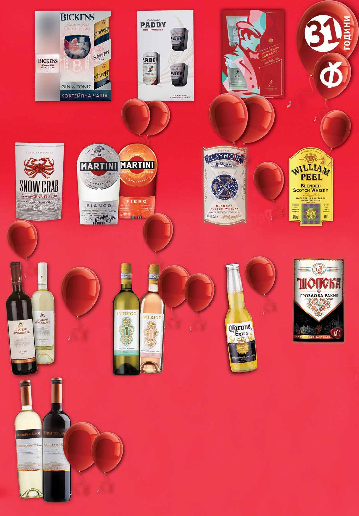 99 лв|бр 28.99 -34% 18 99 лв|бр fiero 18.99 -42% 10 99 лв|бр Bianco 18.99 -42% 10 99 лв|бр 29.99 -26% 21 99 лв|бр 34.99 -40% 20 49 лв|бр 23.99 -52% 11 99 лв|бр 36.99 -43% 20 12.99 -53% 5 99 лв|бр бяло 12.99 -53% 5 99 лв|бр розе 9.49 -50% 4 69 лв|бр 19.99 -50% 9 99 лв|бр 9.99 -40% 5 99 лв|бр 13.99 -57% 5 99 лв|бр мерло 13.99 -57% 5 99 лв|бр шардоне 2.99 -36% 1 89 лв|бр Бира CORONA Екстра 355 мл Вино бяло/Розе INTRIGO произход Италия 750 мл Вино DOMAINE BOYAR Резерва / Селекшън различни видове 750 мл Джин BICKENS розов 700 мл + чаша + газирана напитка SCHWEPPES кен, 2 бр х 330мл Ирландско уиски PADDY 700 мл + 2 чаши Водка SNOW CRAB 700 мл Ракия ШОПСКА гроздова 700 мл Вермут MARTINI Bianco; Fiero 750 мл Вино CHATEAU SUNGURLARE Шардоне; Мерло 750 мл Шотландско уиски* JOHNNIE WALKER Red Label 700 мл + 2 чаши *количествата са ограничени Шотландско уиски CLAYMORE 700 мл Шотландско уиски WILLIAM PEEL 1,5 л отстъпка* -30%Всички видове бира с марка ЗАГОРА с *Отстъпката е валидна от 03.11.-09.11.2022г. и важи за магазините със зелени цени минимум 17ТВ „Фантастико” не носи отговорност за допуснати печатни грешки. Количествата са лимитирани! Предложенията са валидни до сряда 22.00ч. на 09.11.2022 г.