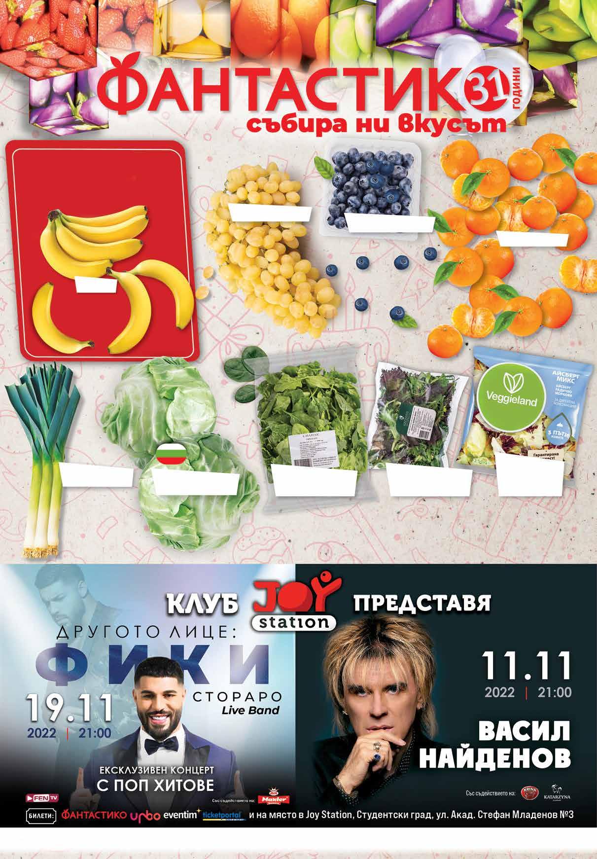 3.29 -39% 1 99 лв|кг 0.79 -37% 0 49 лв|кг 3.99 -35% 2 59 лв|бр 2.99 -33% 1 99 лв|бр 4.59 -21% 3 59 лв|бр 1.49 -33% 0 99 лв|бр 2.99 -33% 1 99 лв|бр4.29 -30% 2 99 лв|кг 3.99 -32% 2 69 лв|кг Праз лук 3 бр връзка Зеле произход България Мандарини Специалнопредложение зачетвъртък,петък,съботаинеделя! от03.11.до06.11. Банани Стафидно грозде Спанак произход България 500 г Салата бейби микс 150 г Салата айсберг микс VEGGIELAND 250 Г Боровинки 125 г Продуктите, обозначени с този символ, са с БЪЛГАРСКИ произход.Снимките са с илюстративна цел. ТВ „Фантастико” не носи отговорност за допуснати печатни грешки. Количествата са лимитирани! Предложенията са валидни до сряда 22.00 ч на 09.11.2022 г.