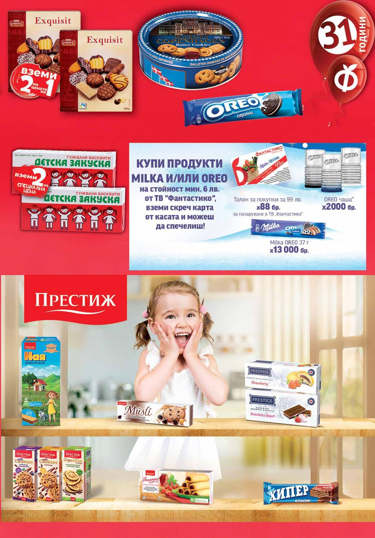2.19 -41% 1 29 лв|бр 2.89 -24% 2 19 лв|бр 2.19 -41% 1 29 лв|бр 6.49 -33% 4 29 лв|бр 10.96 -50% 5 48 лв|2 бр 5.58 -46% 2 99 лв|2 бр 8.99 -50% 4 49 лв|бр 0.75 -34% 0 49 лв|бр 2.19 -31% 1 49 лв|бр 3.29 -39% 1 99 лв|бр Вафли НАЯ различни видове 600 - 653 г Сладки Насладки ПРЕСТИЖ различни видове 134-155 г Вафла ХИПЕР различни видове 55 г Бисквити Oh La La различни видове 134 -153 г Бисквити MŰSLI различни видове 94 г Бисквити DIGESTIVE THINS 120 г; SOFT COOKIES различни видове 120 г Бисквити ОREO различни видове 154 -157 г Бисквити LAMBERTZ Exquisit асорти 2 бр х 200 г Тунквани бисквити ДЕТСКА ЗАКУСКА; ЗЛАТЕН СЕЗОН 2* бр х 170 г *от един и същи вид Бисквити WONDERFUL COPENHAGEN 340 г 2.79 лв + 2.79 лв = Наградата се получава на място в търговския обект, в който е изтеглена печелившата карта.