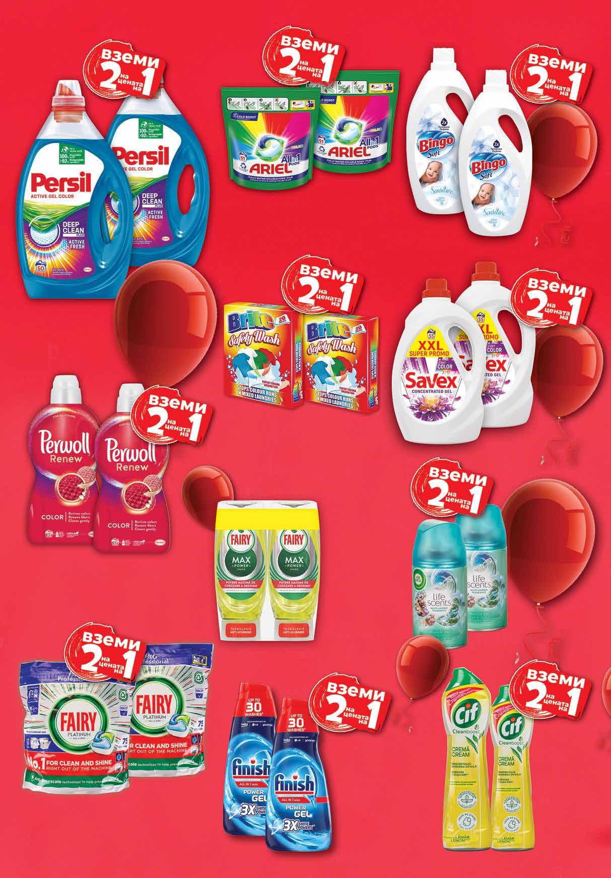 98 лв|2 бр 55.96 -50% 27 98 лв|2 бр 63.96 -50% 31 98 лв|2 бр 43.96 -50% 21 98 лв|2 бр 25.96 -50% 1298 лв|2 оп. 99.96 -50% 49 98 лв|2 бр 35.96 -50% 17 98 лв|2 оп 87.96 -50% 43 19.96 -50% 9 98 лв|2 бр 9.08 -50% 4 54 лв|2 оп. 7 48 лв|к-т 11.56 -50% 5 78 лв|2 бр Гел различни видове 2* бр х 2.5 л *от един и същи вид; Капсули Color 2 оп. х 33 бр в опаковка за пране PERSIL Гел за пране SAVEX 2in1 Color 2 бр х 3.025 л Омекотител BINGO SOFT Sensitive 2 бр х 3 л Капсули за пране ARIEL Allin1 Pods Color 2 оп. х 51 бр в опаковка Препарат за пране PERWOLL black; color 2* бр х 1.92 л *от един и същи вид Пълнител AIR WICK тюркоазен оазис; бели цветя; бял люляк; лавандула; сатен 2* бр х 250 мл *от един и същи вид Гел за съдомиялна FINISH различни видове 2* бр х 600 мл *от един и същи вид Препарат CIF Cream лимон; бял 2* бр х 500 мл *от един и същи вид Цветоулавящи кърпички BRITE за цветно пране 2 оп. х 20 бр в опаковка Таблетки за съдомиялна FAIRY Platinum All in Оne 2 оп. х 75 бр в опаковка Комплект препарат за съдове FAIRY Max Power Lemon; Hygiene 2 бр х 450 мл 22 Продуктите се продават в количества, обичайни за едно домакинство. Декорацията към продуктите не е включена в тяхната цена. ТВ „Фантастико“ си запазва правото на промяна в цените.
