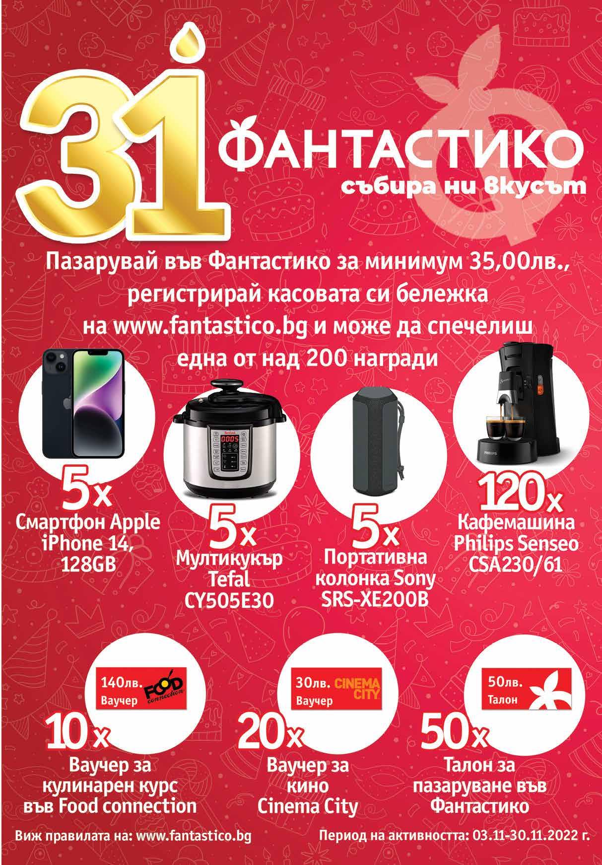 не носи отговорност за законосъобразността й и нейното провеждане 15ТВ „Фантастико” не носи отговорност за допуснати печатни грешки. Количествата са лимитирани! Предложенията са валидни до сряда 22.00ч. на 09.11.2022 г.