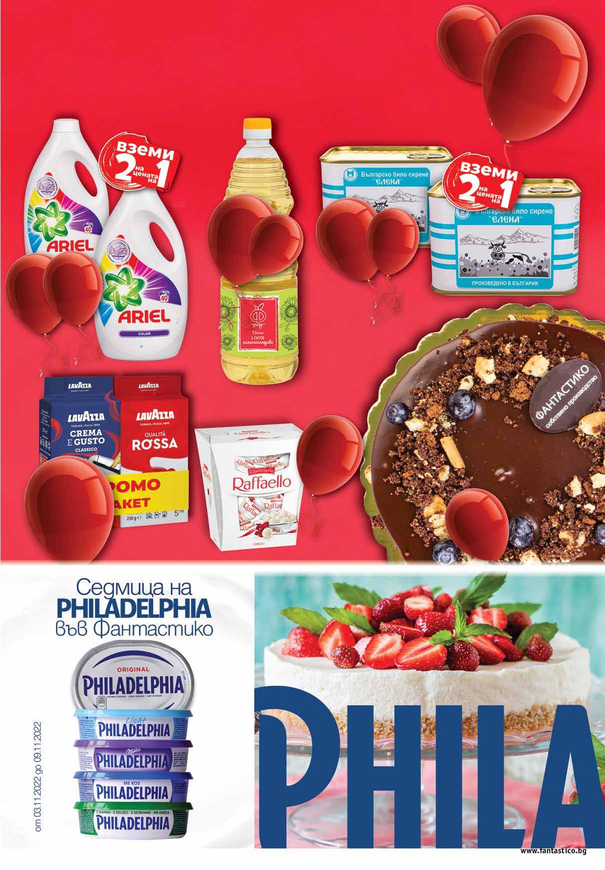 34 лв|2 бр 52.68 -50% 26 9 99 лв|к-т 9.99 -32% 6 79 лв|бр 4.79 -22% 3 69 лв|бр 98 лв|2 бр 25.96 -50% 12 99 лв|бр 17.99 -33% 11 Комплект* мляно кафе LAVAZZA Crema E Gusto + Qualita Rossa 2 х 250 г *количествата са ограничени *Слънчогледово олио Ф ВКУС 1 л *ограничение до 12 бр на клиент Сирене от краве мляко ЕЛЕНА метална кутия 2 бр х 500 г Бонбони RAFFAELLO 230 г Гел за пране ARIEL Color; Mountain Spring 2* бр х 2.2 л *от един и същи вид Бисквитена торта с боровинки 900 г fantastico.stores www.fantastico.bgОФЕРТА ЗА ПЕРИОДА от 03 .11.2022 г. до 22.00 ч . на 09.11.2022 г.