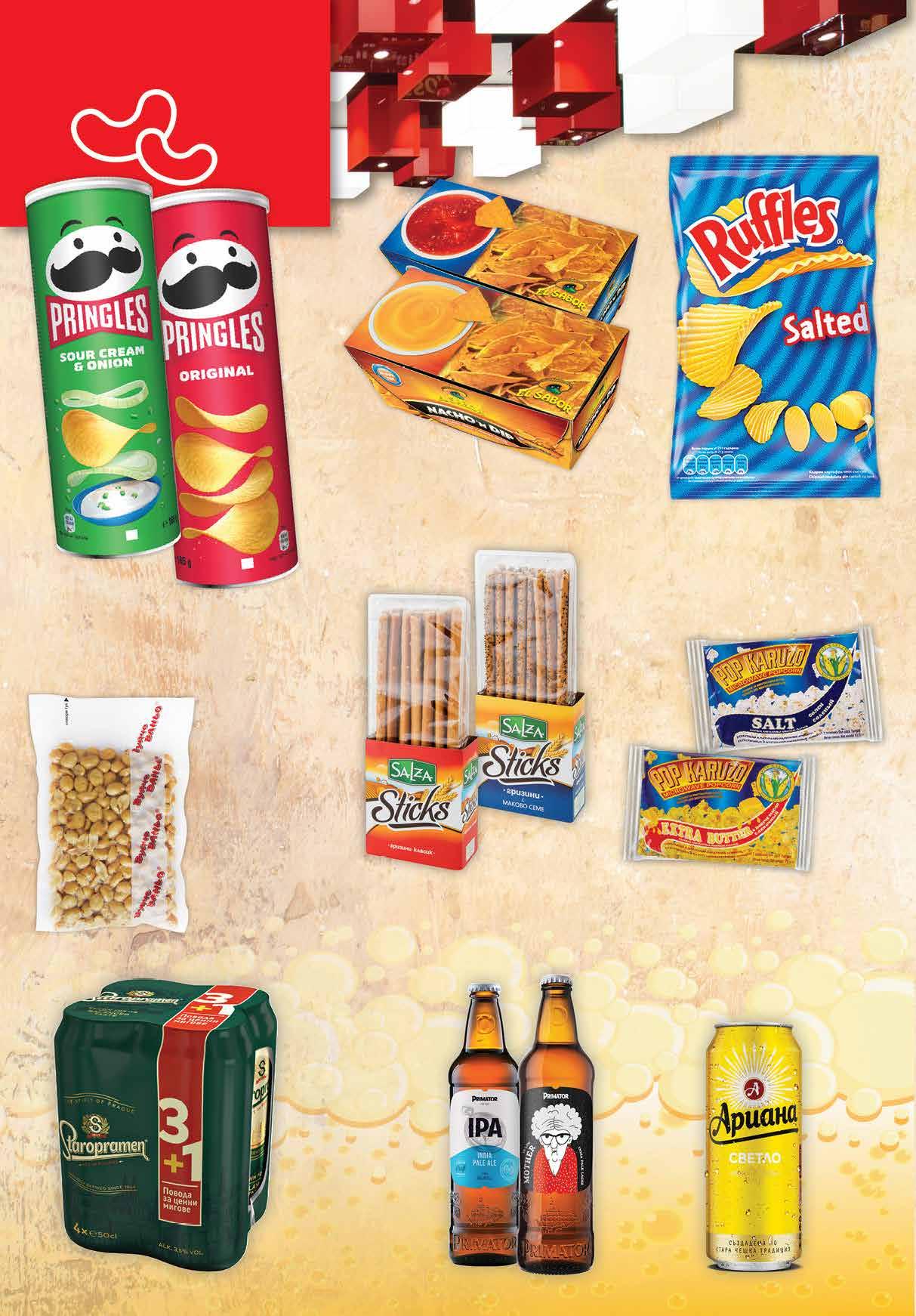 2.59 -23% 1 99 лв|бр 5.99 -33% 3 99 лв|бр 3.99 -25% 2 99 лв|к-т 2.49 -28% 1 79 лв|бр 1.45 -24% 1 09 лв|бр сол 1.45 -24% 1 09 лв|бр масло 3.79 -39% 2 29 лв|бр 1.39 -28% 0 99 лв|бр 3.99 -25% 2 99 лв|бр 6.27 -24% 4 76 лв|бр Комплект царевичен чипс EL SABOR сол 85 г + сос салса 90 г; чили 85 г + сос сирене 90 г Чипс PRINGLES различни вкусове 165 г Пържени фъстъци ВУЙЧО ВАНЬО 160 г Чипс RUFFLES различни вкусове 155 г Гризини SALZA класик; маково семе 235 г Пуканки за микровълнова POP KARUZO с повече масло 78 г; със сол 67 г Бира АРИАНА светло кен, 500 мл Бира PRIMATOR IPA 6.5%; IPL 4.7% ; 500 мл Бира STAROPRAMEN Мултипак 4 бр х 500 мл 16 Продуктите се продават в количества, обичайни за едно домакинство. Декорацията към продуктите не е включена в тяхната цена. ТВ „Фантастико“ си запазва правото на промяна в цените.