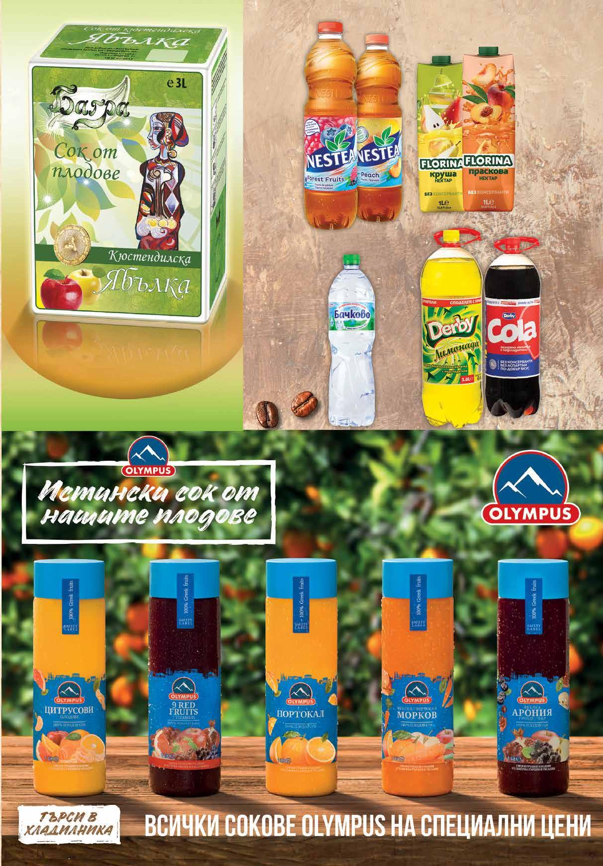 2.89 -31% 1 99 лв|бр 1.85 -35% 1 19 лв|бр 7.99 -20% 6 39 лв|бр 3.39 -29% 2 39 лв|бр 5.49 -30% 3 79 лв|бр 5.49 -45% 2 99 лв|бр арония 0.89 -44% 0 49 лв|бр Студен чай NESTEA различни видове 1.5 л СОК OLYMPUS различни видове 1 л Нектар FLORINA различни видове 1л Газирана напитка DERBY различни видове 3 л Сок от плодове БАГРА ябълка bag-in-box 3 л Изворна вода БАЧКОВО 1,5 л 15 ТВ „Фантастико” не носи отговорност за допуснати печатни грешки. Количествата са лимитирани! Предложенията са валидни до сряда 22.00ч. на 16.11.2022 г.