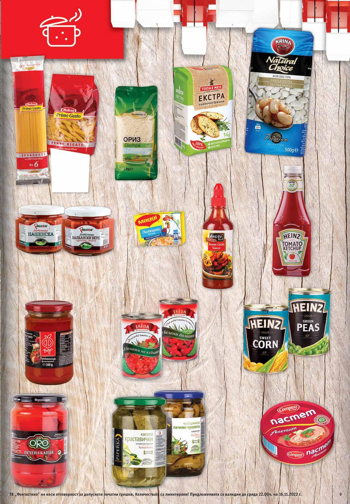 1.59 -25% 1 19 лв|бр 7.49 -20% 5 99 лв|бр 5.49 -27% 3 99 лв|бр 1.99 -25% 1 49 лв|бр 4.99 -20% 3 99 лв|бр 3.69 -21% 2 89 лв|бр 3.99 -25% 2 99 лв|бр чушки 3.99 -25% 2 99 лв|бр краставички 3.99 -32% 2 69 лв|бр 1.69 -17% 1 39 лв|бр 1.79 -27% 1 29 лв|бр цели 1.79 -27% 1 29 лв|бр кубчета 9.59 -37% 5 99 лв|бр 3.49 -48% 1 79 лв|бр 2.69 -29% 1 89 лв|бр 3.29 -27% 2 39 лв|бр Едросмляна лютеницa PHILICON Нашенска; Балкански вкус 350 г Финосмяна лютеницa Ф ВКУС 300 г Ориз Екстра ФАМИЛЕКС 1 кг Капия MYORO печена белена 680 г Боб Екстра KRINA 500 г Пастет COMPASS Апетит 180 г Макарони Пене; Фусили; Звездички; Кус-кус Спагети №6; №7; №10; MELISSA 500 г Кисели краставички; Чорбаджийски печени чушлета PIPERKA 680 г Домати ISIDA белени, цели; на кубчета 400 г Кетчуп HEINZ 1 кг Грах; Червен боб; Сладка царевица HEINZ 400 г Брашно ТОПАЗ МЕЛ пшенично Екстра 1 кг Бульон MAGGI различни видове 80 г Сoс сладко чили EXOTIC FOOD 535 г 9 ТВ „Фантастико” не носи отговорност за допуснати печатни грешки. Количествата са лимитирани! Предложенията са валидни до сряда 22.00ч. на 16.11.2022 г.