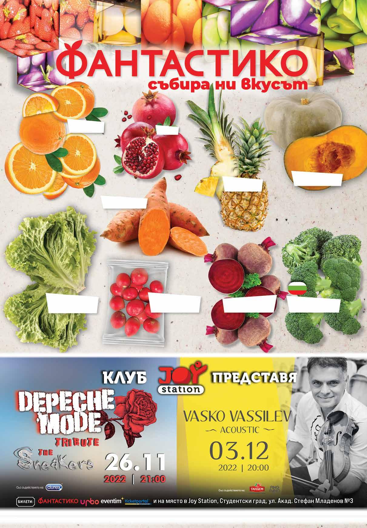 1 99 лв|кг 0.99 -20% 0 79 лв|кг 3.99 -25% 2 99 лв|кг 1.49 -40% 0 89 лв|кг 3.99 -25% 2 99 лв|кг 0.99 -30% 0 69 лв|бр 0.99 -30% 0 69 лв|бр 1.99 -15% 1 69 лв|бр 4.59 -34% 2 99 лв|бр Портокали Зелена салата произход България Репички 150 г произход България Цвекло произход България Броколи произход България Тиква бяла произход България Нар Ананас калибър 9 Сладки картофи Продуктите, обозначени с този символ, са с БЪЛГАРСКИ произход. Снимките са с илюстративна цел. ТВ „Фантастико” не носи отговорност за допуснати печатни грешки. Количествата са лимитирани! Предложенията са валидни до сряда 22.00 ч на 16.11.2022 г.