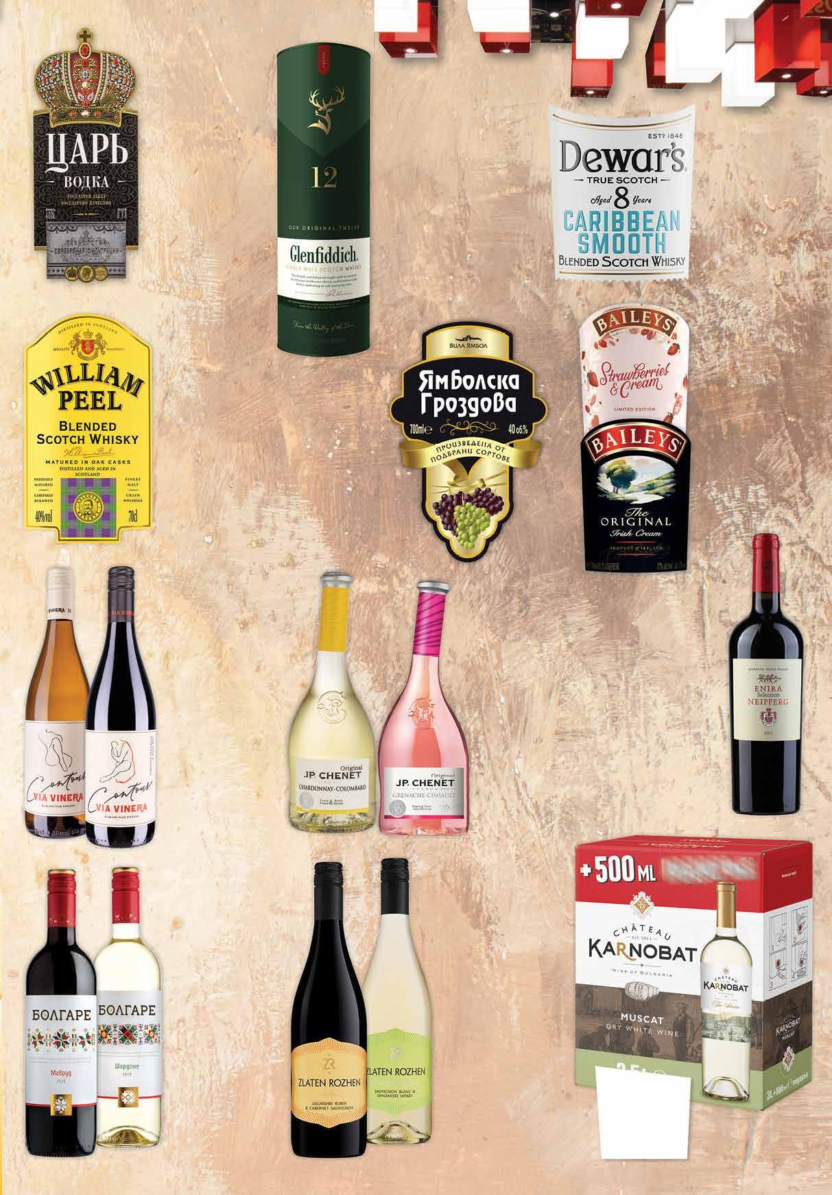 12.59 -36% 7 99 лв|бр 8.49 -23% 6 49 лв|бр 99 лв|бр ягода 44.99 -31% 30 99 лв|бр original 29.99 -23% 22 99 лв|бр 64.99 -23% 49 99 лв|бр 34.99 -31% 23 6.79 -30% 4 69 лв|бр 99 лв|бр 15.99 -25% 11 99 лв|бр 16.49 -21% 12 99 лв|бр 17.99 -33% 11 11.99 -30% 8 39 лв|бр 99 лв|бр 17.49 -31% 11 12.29 -26% 8 99 лв|бр Спиртна напитка ЯМБОЛСКА ГРОЗДОВА 700 мл Вино JP. CHENET произход Франция различни видове 750 мл Шотландско уиски WILLIAM PEEL 700 мл Вино ЗЛАТЕН РОЖЕН различни видове 750 мл Вино ЕНИРА Мерло 750 мл Ликьор BAILЕYS Original; ягода 700 мл Вино БОЛГАРЕ различни видове 750 мл Шотландско уиски GLENFIDDICH 12 г. 700 мл Шотландско уиски DEWAR‘S 8 г. 700 мл Вино Мускат; Мерло CHATEAU KARNOBAT bag-in-box 3 л + 500 мл Вино VIA VINERA Contour Каберне Совиньон и Пино Ноар; Совиньон Блан и Пино Гри 750 мл Водка ЦАРЪ 700 мл 17 ТВ „Фантастико” не носи отговорност за допуснати печатни грешки. Количествата са лимитирани! Предложенията са валидни до сряда 22.00ч. на 16.11.2022 г.