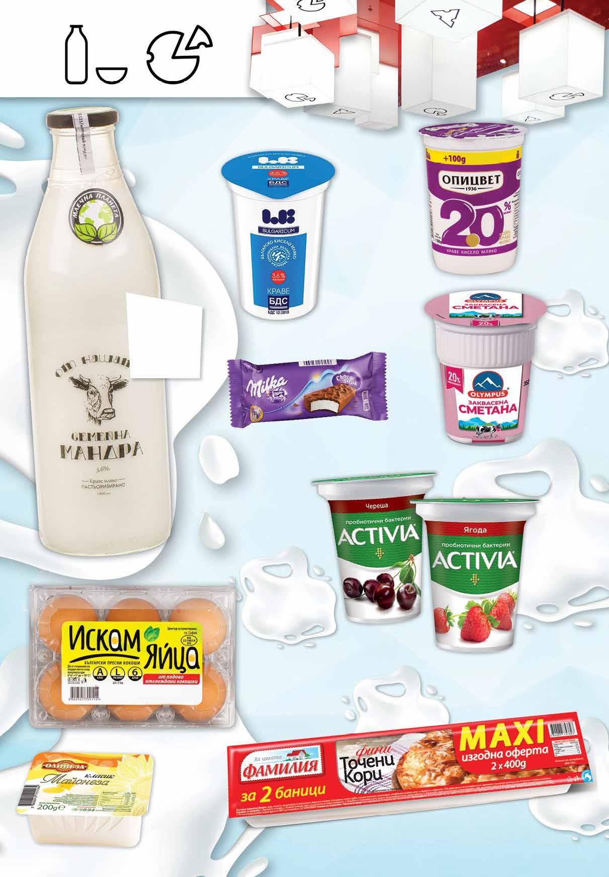 1.55 -36% 0 99 лв|бр 6.29 -30% 4 39 лв|бр 2.09 -23% 1 59 лв|бр 4.29 -25% 3 19 лв|бр 2.15 -16% 1 79 лв|бр 3.69 -25% 2 75 лв|бр 1.65 -21% 1 29 лв|бр 1.55 -20% 1 24 лв|бр 4.99 -20% 3 99 лв|бр Фини точени кори ФАМИЛИЯ Maxi 2 х 400 г Активиа с плодове DANONE различни видове 280 г Майонеза ОЛИНЕЗА Класик 200 г Кисело мляко ЕЛ БИ масленост 3,6% по БДС 400 г Прясно мляко МЛЕЧНА ПЛАНЕТА масленост 3,6% 1* л *амбалажът може да се върне Яйца ИСКАМ ЯЙЦА от подово отглеждани кокошки размер L 6 бр в опаковка Заквасена сметана OLYMPUS масленост 20% 350 г Кисело мляко ОПИЦВЕТ масленост 2% 400+100 г Десерт MILKA Choco Snack 32 г 4 Продуктите се продават в количества, обичайни за едно домакинство. Декорацията към продуктите не е включена в тяхната цена. ТВ „Фантастико“ си запазва правото на промяна в цените.