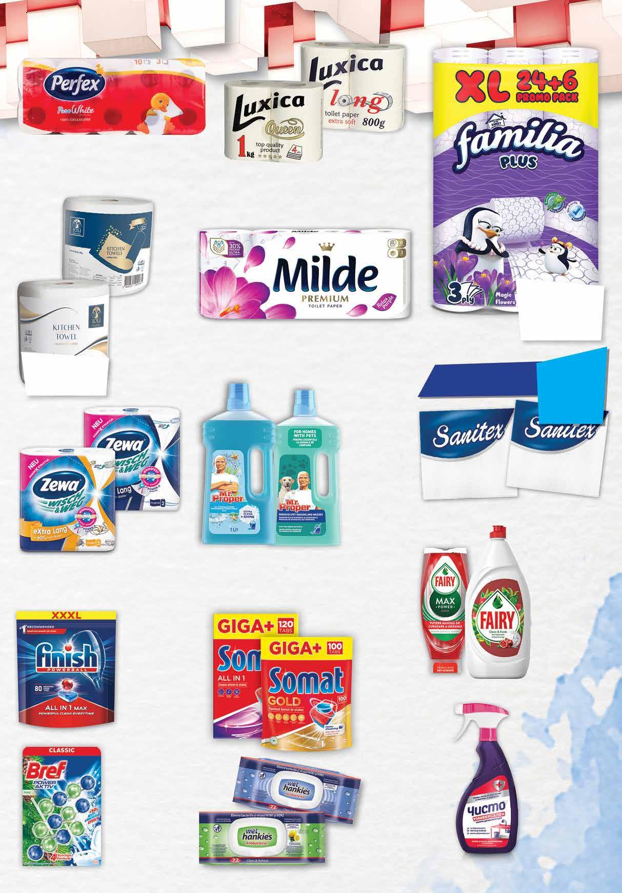 8.89 -32% 5 99 лв|бр 1.2Л 7.49 -20% 5 99 лв|бр 650 мл 4 99 лв|бр 9.99 -33% 6 69 лв|бр design 5 99 лв|к-т 99 лв|бр 39.99 -25% 29 10.89 -28% 7 79 лв|бр original 4.55 -29% 3 19 лв|бр 10.95 -25% 8 19 лв|бр 1 кг 8.99 -25% 6 69 лв|бр 800 г 6.99 -30% 4 89 лв|бр basic 3.99 -30% 2 79 лв|бр jumbo 99 лв|бр 47.49 -45% 25 6.48 -38% 3 99 лв|бр 10.89 -33% 7 19 лв|бр 6.49 -30% 4 49 лв|бр за под 8.69 -33% 5 79 лв|бр 99 лв|бр 22.99 -30% 15 Препарат за съдове FAIRY МАХ POWER 650 мл; 1,2 л различни видове Препарат Mr.PROPER за дървени повърхности; за домове с домашни любимци; за деликатни повърхности 1 л Комплект ароматизатор за WC BREF Power Aktiv 3 бр х 50 г различни видове Тоалетна хартия FAMILIA Magic Flowers; White трипластова 24+6 бр пакет Препарат за под Mr.PROPER лавандула; лимон; океан; цветя 1 л Тоалетна хартия PERFEX Pure White; лайка; праскова 10 бр пакет, трипластова Тоалетна хартия MILDE 8 бр в пакет трипластовa различни видове Таблетки за съдомиялна SOMAT Giga+ All In 1, 120 бр; Gold, 100 бр Препарат ЧИСТО универсален; обезмаслител за кухня; за баня 700 мл; мулти дезинфектант; против мухъл и плесен 500 мл Антибактериални кърпи HANKIES Clean; Lemon 72 бр в пакет Тоалетна хартия LUXICA четирипластова 1 кг; трипластова 800 г 4 бр бяла Кухненско руло JOLI Jumbo; Bаsic 1 бр Таблетки за съдомиялна машина FINISH All in1 Max 80 бр; Quantum 60 бр; Quantum Ultimate 50 бр различни видове Купи салфетки с марка SANITEX с отстъпка Минимум -20% Кухненско руло ZEWA Wisch And Weg Original - 2 бр в опаковка; Design – 2 бр в опаковка 23 ТВ „Фантастико” не носи отговорност за допуснати печатни грешки. Количествата са лимитирани! Предложенията са валидни до сряда 22.00ч. на 16.11.2022 г.