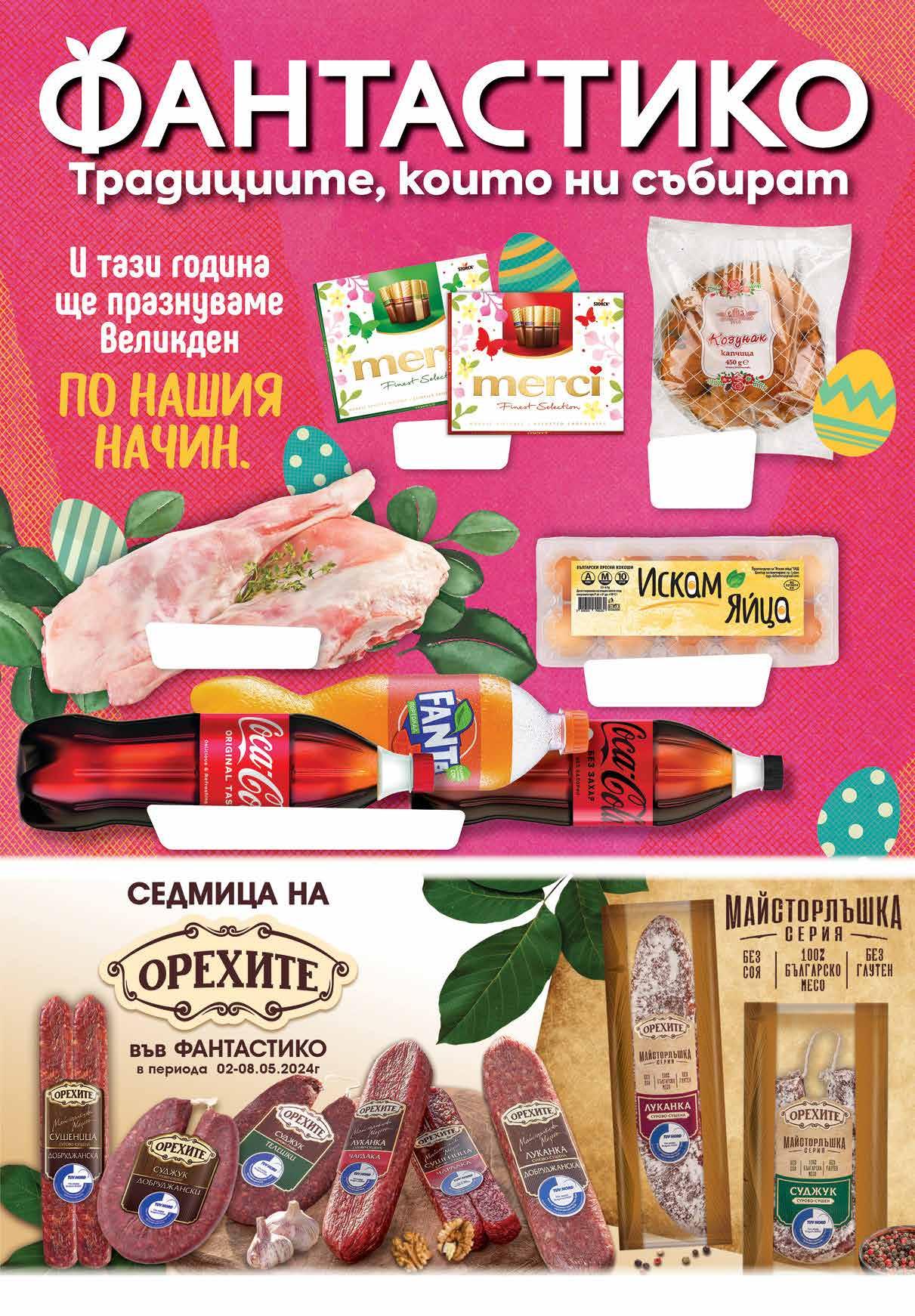 9.69 -27% 6 99 лв|бр 3.29 -18% 2 69 лв|БР 5.49 -38% 3 39* лв|оп. 5.99 -25% 4 49 лв|бр Газирана напитка COCA-COLA; FANTA; SPRITE различни видове 2 л Прясно агнешко месо *количествата са ограничени Бонбони MERCI различни видове 250 г Яйца ИСКАМ ЯЙЦА размер M, 10 бр в опаковка *цената е валидна до 05.05.2024 г. Козунак Kапчица ЕЛИАЗ с шоколадови капчици 450 г fantastico.stores www.fantastico.bg ОФЕРТА ЗА ПЕРИОДА от 02 .05.2024 г. до 22.00 ч . на 08.05.2024 г.
