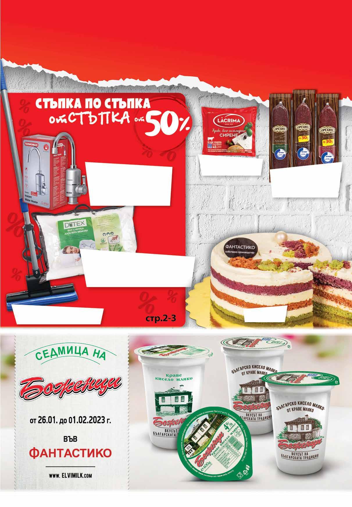 99 лв|бр възглавница 29.99 -60% 11 14.99 -50% 7 49 лв|бр 99 лв|бр 19.99 -25% 14 99 лв|бр 74.99 -50% 36 9.99 -25% 7 49 лв|бр 9.99 -25% 7 49 лв|бр телешка 99 лв|бр 16.59 -27% 11 Възглавница Алое Вера Мемори 50/70 см; • Пълнеж: парченца от 100% мемори пяна • Обшивка – импрегнирана с есенция от Алое Вера. • Хипоалергенните свойства на екстракта от Алое Вера предпазват от бактерии и микроорганизми. Водонагревател TERMOMAX за стена TX31W; за плот TX33T • Електрически смесител за топла и студена вода 3200W • Практичен и модерен дизайн • Бързо загряване и енергоспестяване • Загряване на водата за секунди (температура 30-60°C) Торта Рейнбоу 750 г Сирене от краве мляко LACRIMA по БДС; вакуум, 700 г Моп за почистване ЕС и КЕЙ • единичен изстискващ механизъм • метална дръжка Луканка Добруджанска 180 г + 30 г; Чардака 210 г+ 30 г; Телешка 170 г ОРЕХИТЕ вакуум www.fantastico.bg fantastico.stores ОФЕРТА ЗА ПЕРИОДА от 26 .01.2023 г. до 22.00 ч . на 01.02.2023 г.