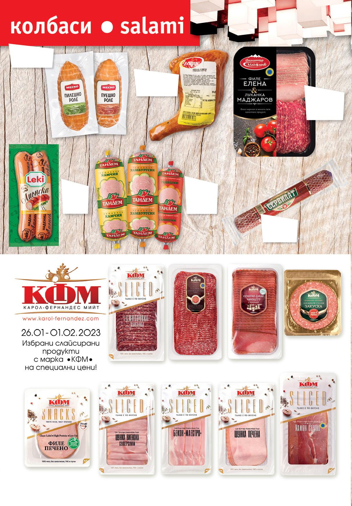 5.19 -25% 3 89 лв|бр 5.19 -23% 3 99 лв|бр 5.19 -23% 3 99 лв|бр 4.99 -24% 3 79 лв|бр 6.59 -31% 4 49 лв|бр 5.19 -23% 3 99 лв|бр 5.19 -23% 3 99 лв|бр 5.99 -21% 4 69 лв|бр 5.19 -23% 3 99 лв|бр 5.99 -21% 4 69 лв|бр 6.99 -21% 5 49 лв|бр пилешко 7.49 -20% 5 99 лв|бр пуешко 12.49 -24% 9 49 лв|бр 8.99 -22% 6 99 лв|кг 99 лв|бр Филе 15.99 -25% 11 99 лв|бр луканка 13.99 -21% 10 Луканка Панагюрска; Сушено филе с чубрица вакуум , 400 г Луканков салам Закуска КФМ вакуум, 160 г Роле МЕСКО пуешко; пилешко вакуум, 270 г Салам Сервилат ЕЛИТ МЕС вакуум, 270 г Печено филе КФМ вакуум, 160 г Лионска наденица LEKI вакуум, 400 г Филе Елена и Луканка МАДЖАРОВ слайс вакуум, 170 г Луканка Смядовска КФМ вакуум 100 г Хамон Серано КФМ вакуум 100 г Виенска шунка вакуум, 120 г Печена шунка вакуум, 120 г Колбас ТАНДЕМ Телешки; Камчия; Хамбургски 300 г Бекон Маестро вакуум 100 г Пилешко бутче варено-пушено ГРАДУС вакуум 8 Продуктите се продават в количества, обичайни за едно домакинство. Декорацията към продуктите не е включена в тяхната цена. ТВ „Фантастико“ си запазва правото на промяна в цените.