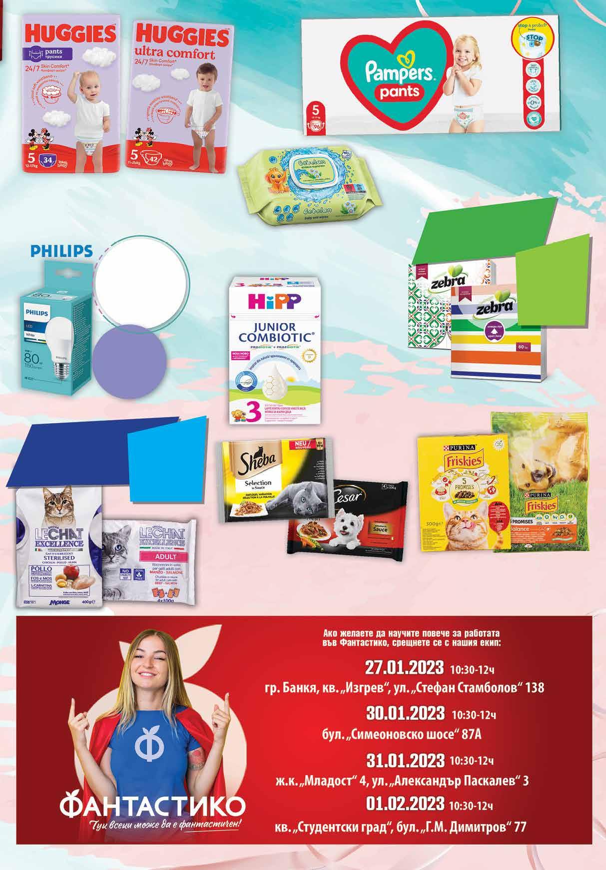 3.49 -25% 2 59 лв|бр 3.49 -25% 2 59 лв|бр куче 5.69 -22% 4 39 лв|бр 99 лв|оп. 44 99 лв|оп. 21 99 лв|бр 19 2 89 лв|оп. Комплект: храна за котки SHEBA 4 бр х 85 г; 6 бр х 50 г, пауч; храна за кучета CESAR 4 бр х 100 г, пауч различни видове Всички храни за котки с марка Lechat Excellence с Храна за котки суха 300 г; Храна за куче суха 500 г различни видове FRISKIES *предложението е валидно за магазините със сини цени отстъпка -25% Mляко HIPP Junior combiotic №3 за деца над 12 месеца 500 г Бебешки пелени MEGA BOX различни размери 88 бр, 96 бр, 104 бр, 108 бр, 110 бр, 132 бр в опаковка Бебешки пелени 42 бр, 50 бр, 56 бр в оп. Бебешки гащички 30 бр, 34 бр, 36 бр в оп. различни размери HUGGIES Бебешки кърпи BEBELAN различни видове 80 бр в оп. с капак Всички салфетки с марка ZEBRA с отстъпка МИНИМУМ -20% LED ЛАМПА с марка PHILIPS Е27 6,5W; 11W; 13W с -25% *предложението е валидна за магазините със сини цени 21 ТВ „Фантастико” не носи отговорност за допуснати печатни грешки. Количествата са лимитирани! Предложенията са валидни до сряда 22.00ч. на 01.02.2023 г.