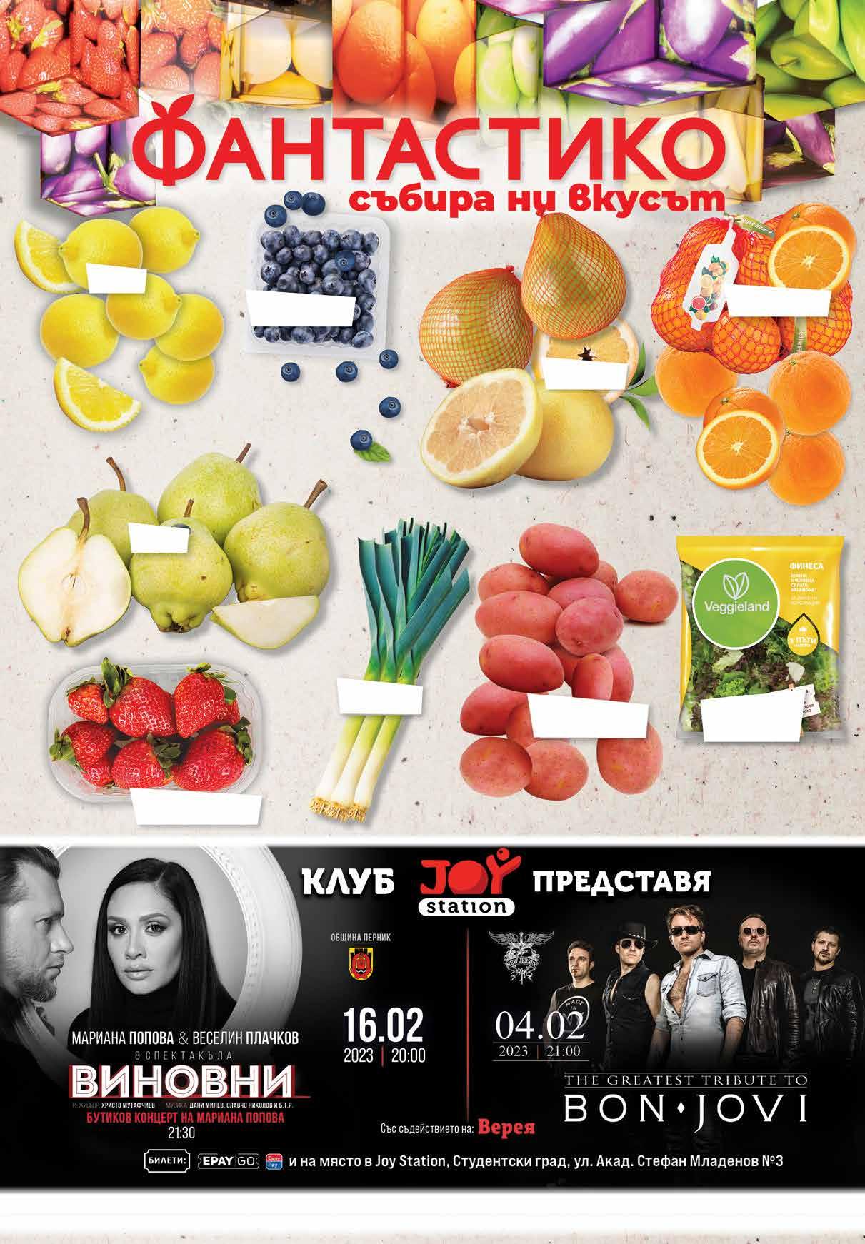 99 лв|кг 23.99 -20% 18 99 лв|кг 14.99 -26% 10 99 лв|к-т 16.97 -17% 13 99 лв|кг 31.99 -21% 24 3.29 -24% 2 49 лв|бр 3.29 -24% 2 49 лв|бр 11.50 -26% 8 50 лв|кг 5.89 -23% 4 49 лв|бр 2.29 -21% 1 79 лв|бр 3.19 -21% 2 49 лв|бр Салата Кьопоолу ВЕСЕЛИНА насипна от щандова витрина Салата Снежанка ОЛИНЕЗА 400 г Руска салата с шунков колбас Ф ВКУС 400 г Хумус VERNADA Натурален 250 г *предложението е валидно за магазините със сини цени Вземи сандвич с луканка с отстъпка -20% Филе скумрия печено на скара Ориз по китйски + 12,99 + 1,99 + 1,99 = Печено пиле + 2* бр х COCA-COLAкласик; без захар 1 л *от един и същи вид Кашкавал пане Печена пилешка пържола от бут Хайдушки кюфтак на скара 11 ТВ „Фантастико” не носи отговорност за допуснати печатни грешки. Количествата са лимитирани! Предложенията са валидни до сряда 22.00ч. на 01.02.2023 г.
