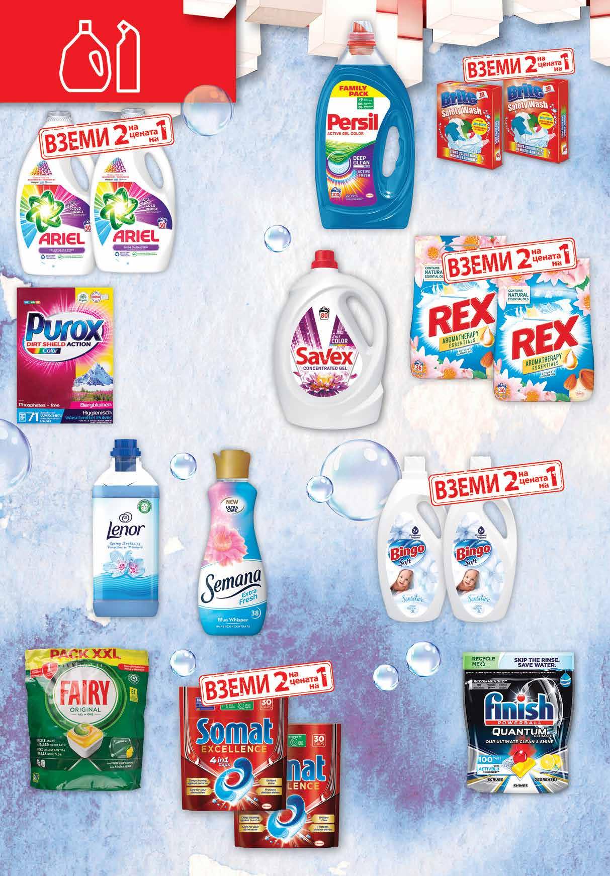98 лв|2 oп. 59.96 -50% 29 4.92 -50% 2 46 лв|2 оп. 98 лв|2 бр 25.96 -50% 12 99 лв|бр 31 98 лв|2 бр 67.96 -50% 33 98 лв|2 бр 39.96 -50% 19 99 лв|бр 10 99 лв|оп. 39 99 лв|оп. 20 99 лв|бр 34.99 -34% 22 5.99 -33% 3 99 лв|бр 10.99 -42% 6 29 лв|бр Гел 4.3 л; Прах 5 кг за пране PUROX различни видове Омекотител LENOR 1.7 л различни видове Омекотител BINGO SOFT Sensitive 2 бр х 3 л Таблетки за съдомиялна машина FAIRY ALL IN 1 LEMON 81 бр в опаковка Гел Color; Regular; Sensitive 5 л; Капсули Power Сaps Сolor 70 бр в опаковка за пране PERSIL Гел за пране SAVEX различни видове 4.4 л Таблетки за съдомиялна машина FINISH Quantum Ultimate 100 бр в опаковка Гел 2* бр х 900 мл Таблетки Excellence 2* оп. х 30 бр. в опаковка; All in 1, 2* оп. х 48 бр. в опаковка за съдомиялна SOMAT *от един и същи вид Омекотител SEMANA различни видове 950 мл Гел за пране Ariel Color 2 бр х 2.75 л Прах за пране REX Оrchid; Lotus 2* бр х 2.5 кг *от един и същи вид Цветоулавящи кърпи BRITE за цветно пране 2 оп. х 10 бр в опаковка 22 Продуктите се продават в количества, обичайни за едно домакинство. Декорацията към продуктите не е включена в тяхната цена. ТВ „Фантастико“ си запазва правото на промяна в цените.