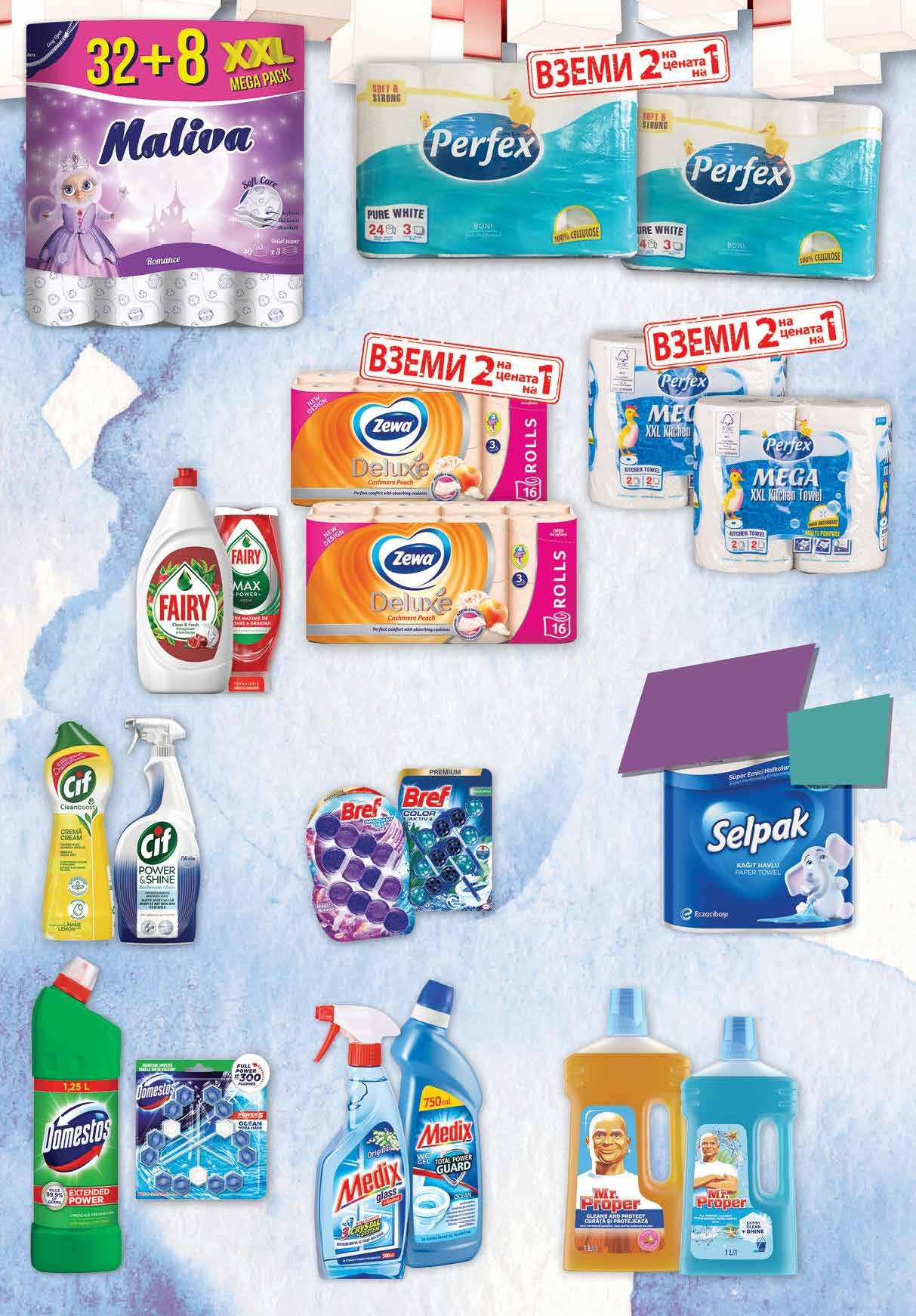 4 69 лв|бр 44 лв|2 оп. 34.88 -50% 17 98 лв|2 оп. 45.96 -50% 22 99 лв|оп. 23 5 69 лв|бр препарат 5 69 лв|к-т 2 49 лв|бр 5 99 лв|бр 6 69 лв|бр 5 99 лв|бр дърво 4 59 лв|бр за под 5 99 лв|бр 650 мл 9.96 -50% 4 98 лв|2 оп. Препарат за съдове FAIRY МАХ POWER 650 мл; 900 мл, 1,2 л различни видове Препарат DOMESTOS бор, атлантик 1,25 л; Ароматизатор DOMESTOS WC Power комплект 3 бр х 55 г Препарат Mr.PROPER за подлавандула, лимон, океан, цветя; за дървени повърхности 1 л Тоалетна хартия ZEWA Deluxe 2* оп. х 16 бр в опаковка, трипластова различни видове *от един и същи вид Тоалетна хартия PERFEX Pure White 2 оп. х 24 бр в опаковка Комплект ароматизатор за WC BREF Color Aktiv, Switch Perfume, Deluxе 3 бр х 50 г Brilliant 3 бр х 42 г различни видове Препарат MEDIX експерт; за стъкла помпа 500 мл; WC гел 750 мл Тоалетна хартия MALIVA Romance 32+8 бр в опаковка, трипластова Препарат CIF CREAM различни видове 700 мл CIF POWER за баня 750 мл Всички кухненски рула с марка SELPAK с отстъпка -25% *предложението е валидно за магазините със сини цени Кухненско руло PERFEX Меga 2 оп. х 2 бр в опаковка 23 ТВ „Фантастико” не носи отговорност за допуснати печатни грешки. Количествата са лимитирани! Предложенията са валидни до сряда 22.00ч. на 01.02.2023 г.