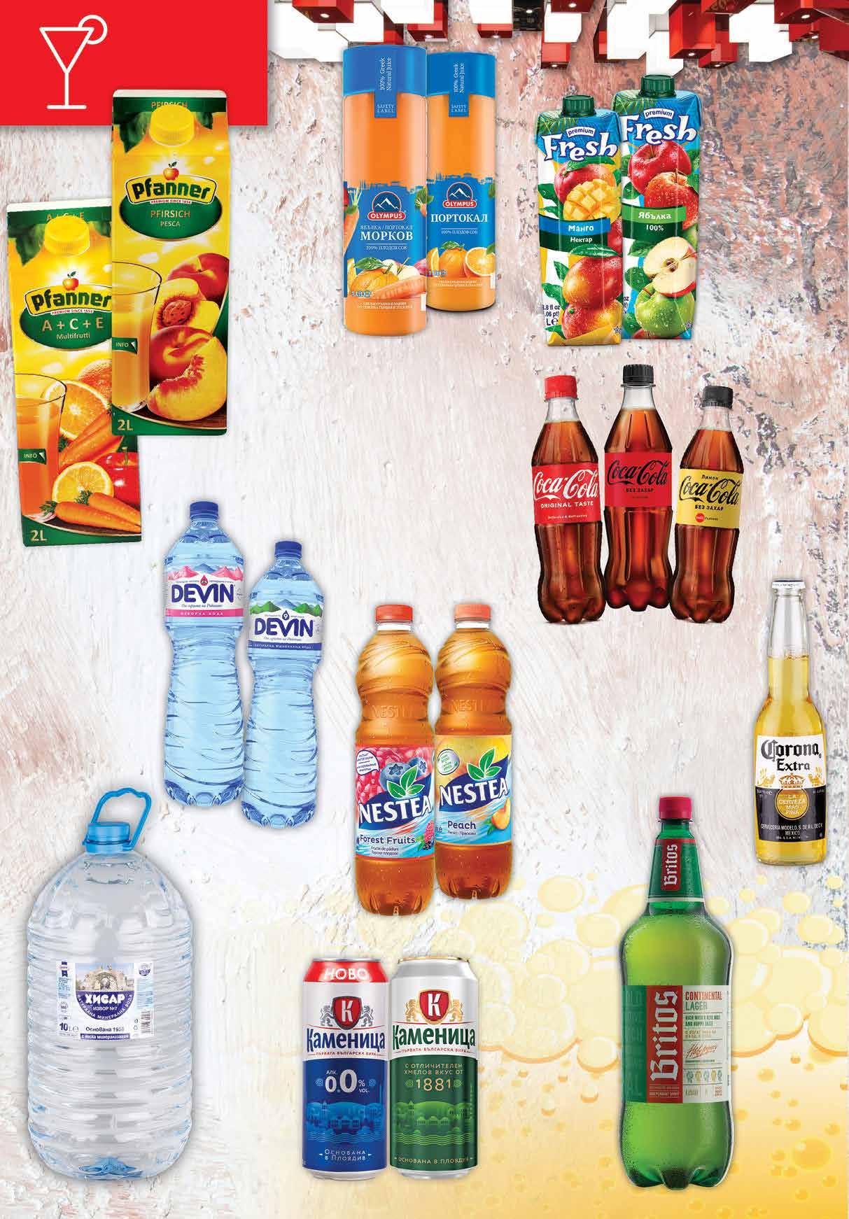 1.09 -31% 0 75 лв|бр 5.49 -27% 3 99 лв|бр 4.79 -25% 3 59 лв|бр 1.59 -21% 1 25 лв|бр 2.89 -31% 1 99 лв|бр 3.49 -31% 2 39 лв|бр 5.39 -25% 3 99 лв|бр мултивит 5.39 -25% 3 99 лв|бр праскова 2.99 -23% 2 29 лв|бр 1.69 -29% 1 19 лв|бр светло 1.69 -29% 1 19 лв|бр безалк. 2.59 -23% 1 99 лв|бр Бира CORONA Екстра 355 мл Бира BRITOS PET, 2 л Бира КАМЕНИЦА светло; безалкохолна кен, 500 мл Сок OLYMPUS различни видове 1 л Минерална/ Изворна вода DEVIN 1,5 л Газирана безалкохолна напитка COCA-COLA; FANTA; SPRITE различни видове 500 мл Сок Ябълка 100%; Нектар Ананас, Портокал; Манго Плодова напитка Ягода и банан FRESH PREMIUM 1 л Плодова напитка PFANNER Мултивитамин с витамини A+С+Е; Праскова 2 л Минерална вода ХИСАР РЕТ, 10 л Студен чай NESTEA различни видове 1.5 л 16 Продуктите се продават в количества, обичайни за едно домакинство. Декорацията към продуктите не е включена в тяхната цена. ТВ „Фантастико“ си запазва правото на промяна в цените.