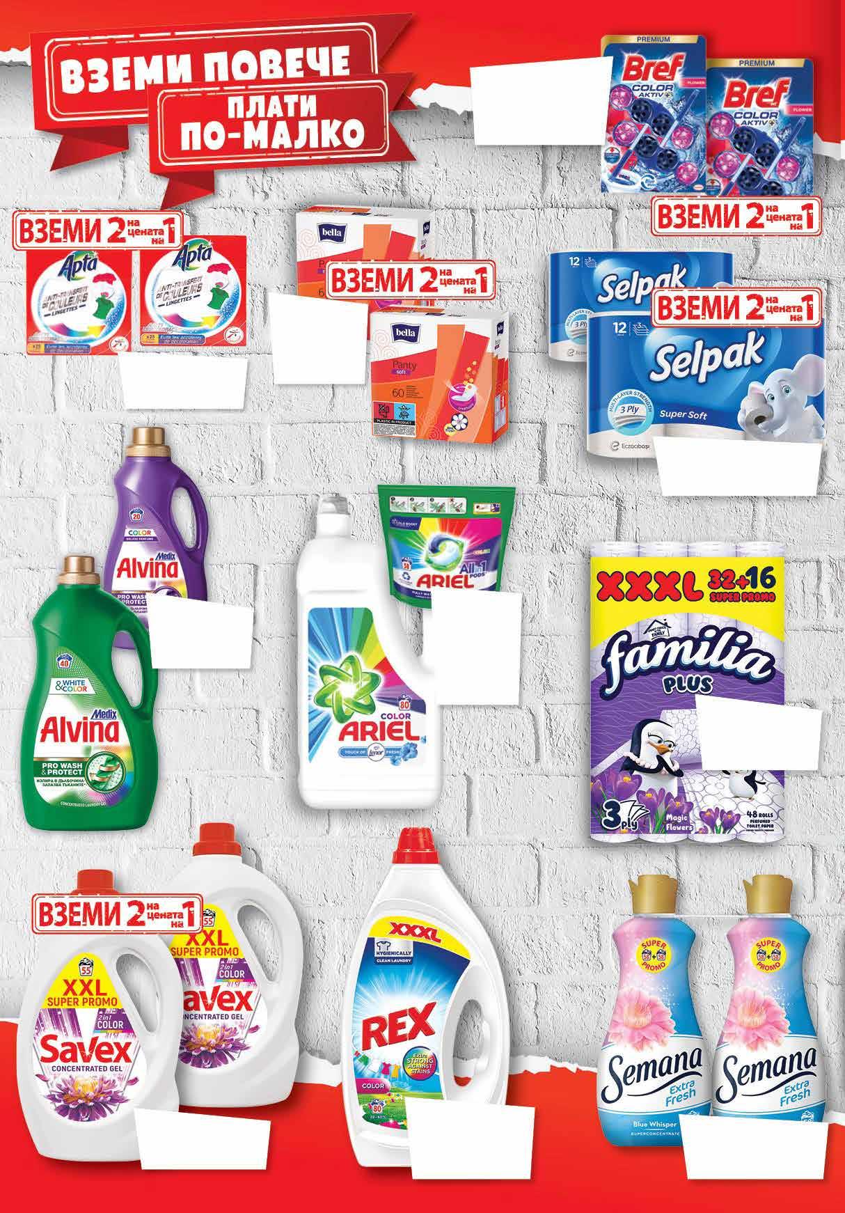 11.96 -50% 5 98 лв|2 оп. 7.56 -50% 3 78 лв|2 оп. 99 лв|к-т 10 99 лв|бр 29 98 лв|2 бр 63.96 -50% 31 99 лв|бр 2.2Л 16.35 -32% 10 8.59 -30% 5 99 лв|бр 1.1Л 99 лв|бр 17 84 лв|2 оп. 31.68 -50% 15 99 лв|оп. 25 14.96 -50% 7 48 лв|2 оп. Цветоулавящи кърпи APTA за цветно пране 2 оп. х 25 бр в опаковка Дамски превръзки BELLA SOFT ежедневни 2 оп. х 60 бр е опаковка Koмплект oмекотител SEMANA Blue Whisper; Violet 2 бр х 1.45 л Гел за пране различни видове 3,96 л; 4.4 л Kапсули за пране color 58 бр ARIEL Тоалетна хартия SELPAK бяла, трипластова 2 оп. х 12 бр в опаковка Ароматизатор за WC BREF Color Aktiv различни видове 2* оп. х 2 бр х 50 г *от един и същи вид Тоалетна хартия FAMILIA различни видове 32+16 бр в опаковка Гел за пране SAVEX 2в1 Color 2 бр х 3.025 л Гел за пране 1.1 л; 2.2 л ALVINA различни видове Гел за пране 4 л; различни видове Капсули за пране 52 бр в опаковка REX КОМПЛЕК Т ОМПЛЕ О ЛМП ЕК К 2 Продуктите се продават в количества, обичайни за едно домакинство. Декорацията към продуктите не е включена в тяхната цена. ТВ „Фантастико“ си запазва правото на промяна в цените.
