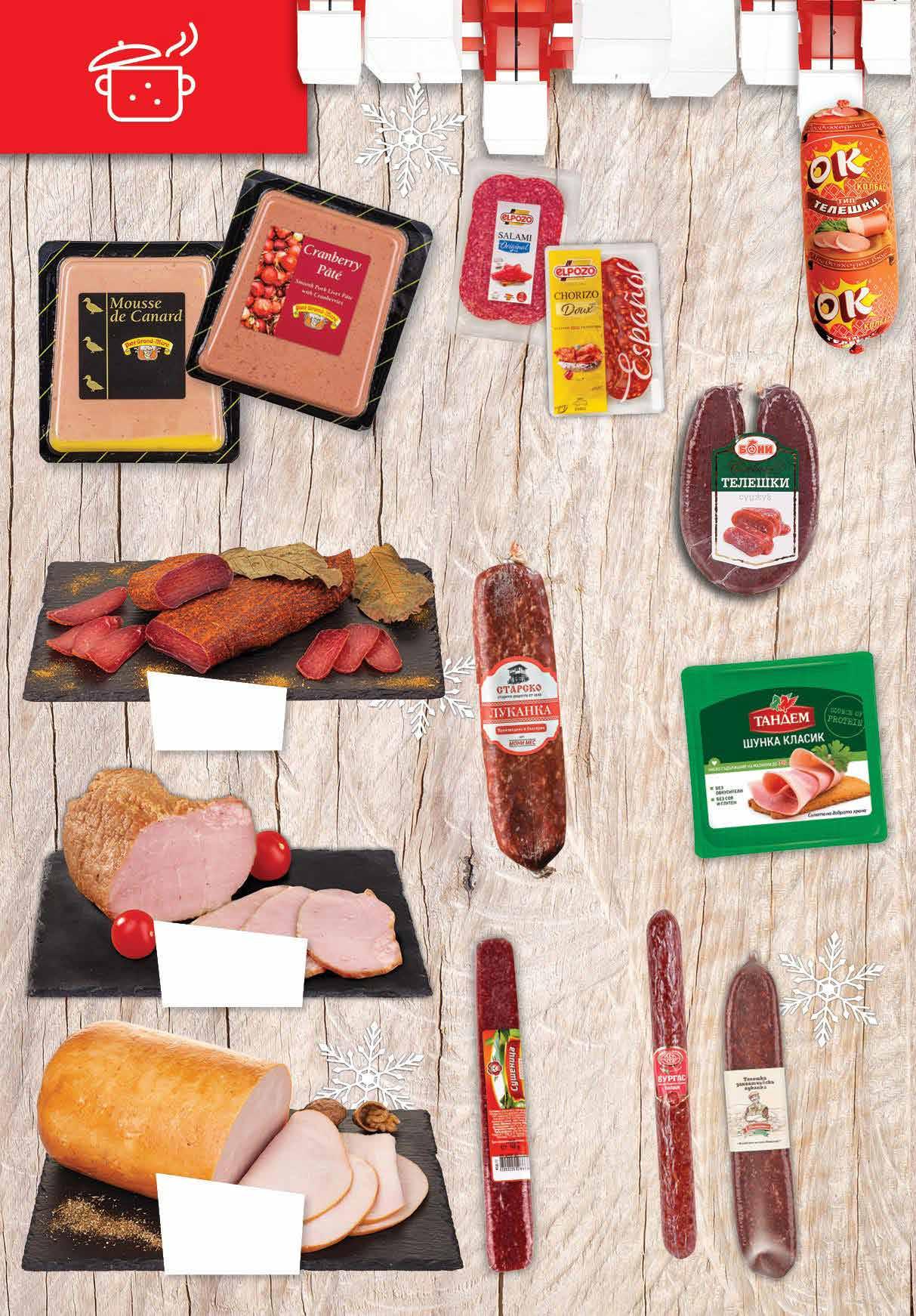 3.19 -25% 2 39 лв|бр пастет 4.39 -25% 3 29 лв|бр мус 6.99 -21% 5 49 лв|бр 99 лв|кг 27.99 -53% 12 99 лв|кг 47.99 -22% 36 99 лв|кг 39.99 -25% 29 7.79 -25% 5 79 лв|бр 3.89 -23% 2 99 лв|бр 12.99 -23% 9 99 лв|кг 4.49 -33% 2 99 лв|бр 3.99 -35% 2 59 лв|бр 6.49 -23% 4 99 лв|бр 9.99 -25% 7 49 лв|бр Мус патешки дроб; Пастет червена боровинка САРАНДА 125 г Салам Бургас КЕН червен етикет вакуум, 260 г Свински бут варено-пушен насипен от щандова витрина СММ Колбас тип телешки ОК вакуум, 700 г Луканка СТАРСКО вакуум, 180 г МОНИ МЕС Телешки суджук БОНИ вакуум, 180 г Телешка луканка Занаятчийска ДЕЛИКАТЕС ЖИТНИЦА насипна от щандова витрина Пуешки деликатес варено-пушен ОРЕХИТЕ насипен от щандова витриан Говежда пастърма насипна от щандова витрина УНИТЕМП Шунка ТАНДЕМ Класик слайс, 220 г Сушеница ЦАРЕВЕЦ вакуум, 140 г ЕЛИТ МЕС Чоризо Doux; Салам Original ELPOZO слайс, 80 г 8 Продуктите се продават в количества, обичайни за едно домакинство. Декорацията към продуктите не е включена в тяхната цена. ТВ „Фантастико“ си запазва правото на промяна в цените.