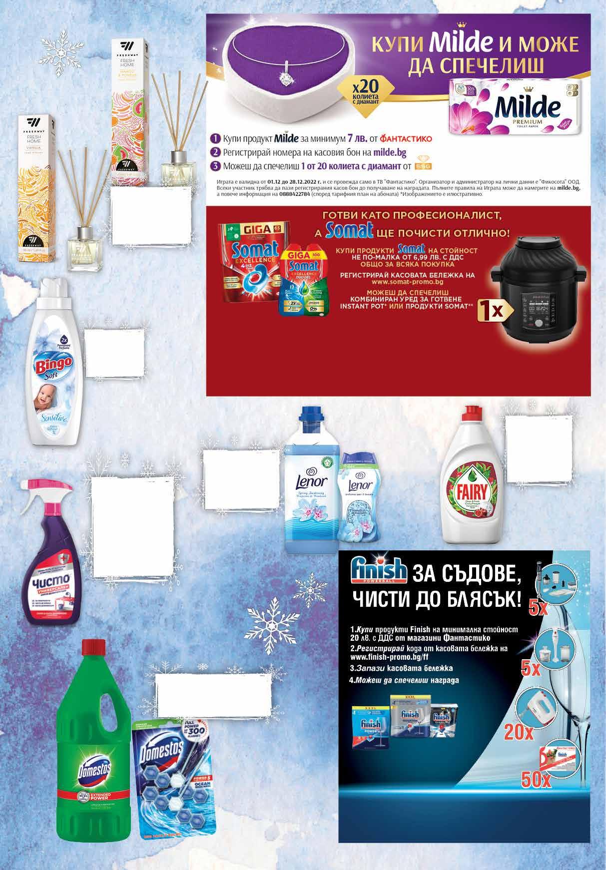 3.79 -29% 2 69 лв|бр 7 89 лв|бр 3 79 лв|к-т 4.99 -40% 2 99 лв|бр 99* лв|бр all in 1 25 99* лв|бр 25 4 99 лв|бр 6 29 лв|бр 6 29 лв|бр перли 6 99 лв|бр 100 мл 5 59 лв|бр 50 мл 99 лв|бр 23 7 59 лв|бр Препарат за съдове FAIRY Classic червен портокал и нар; лайка; лимон 450 мл Препарат Атлантик; Бор 2 л/ Комплект ароматизатор за WC различни видове 2 бр х 55 г DOMESTOS Омекотител BINGO различни видове 1 л Омекотител различни видове 1.7 л Aроматизиращи перли 140г LENOR Таблетки за съдомиялна машина FINISH All in1 Max 80 бр; Quantum 60 бр; Quantum Ultimate 50 бр различни видове Препарат ЧИСТО универсален; обезмаслител за кухня; за баня 700 мл; мулти дезинфектант; против мухъл и плесен 500 мл *цената е валидна за перода от 15.12. до 21.12.2022г. Ароматизатор FRESH HOME 100 мл + пръчици; 50 мл + пръчици различни видове Tаблетки за съдомиялна All in 1, 80 бр в опаковка; Excellencе 51 бр в опаковка Комплект гел за съдомиялна 2 бр х 684 мл SOMAT *цената е валидна за перода от 15.12. до 21.12.2022г. * цената е валидна от 15.12 до 21.12.2022г. Тоалетна хартия MILDE 8 бр в пакет трипластовa различни видове 22 Продуктите се продават в количества, обичайни за едно домакинство. Декорацията към продуктите не е включена в тяхната цена. ТВ „Фантастико“ си запазва правото на промяна в цените.