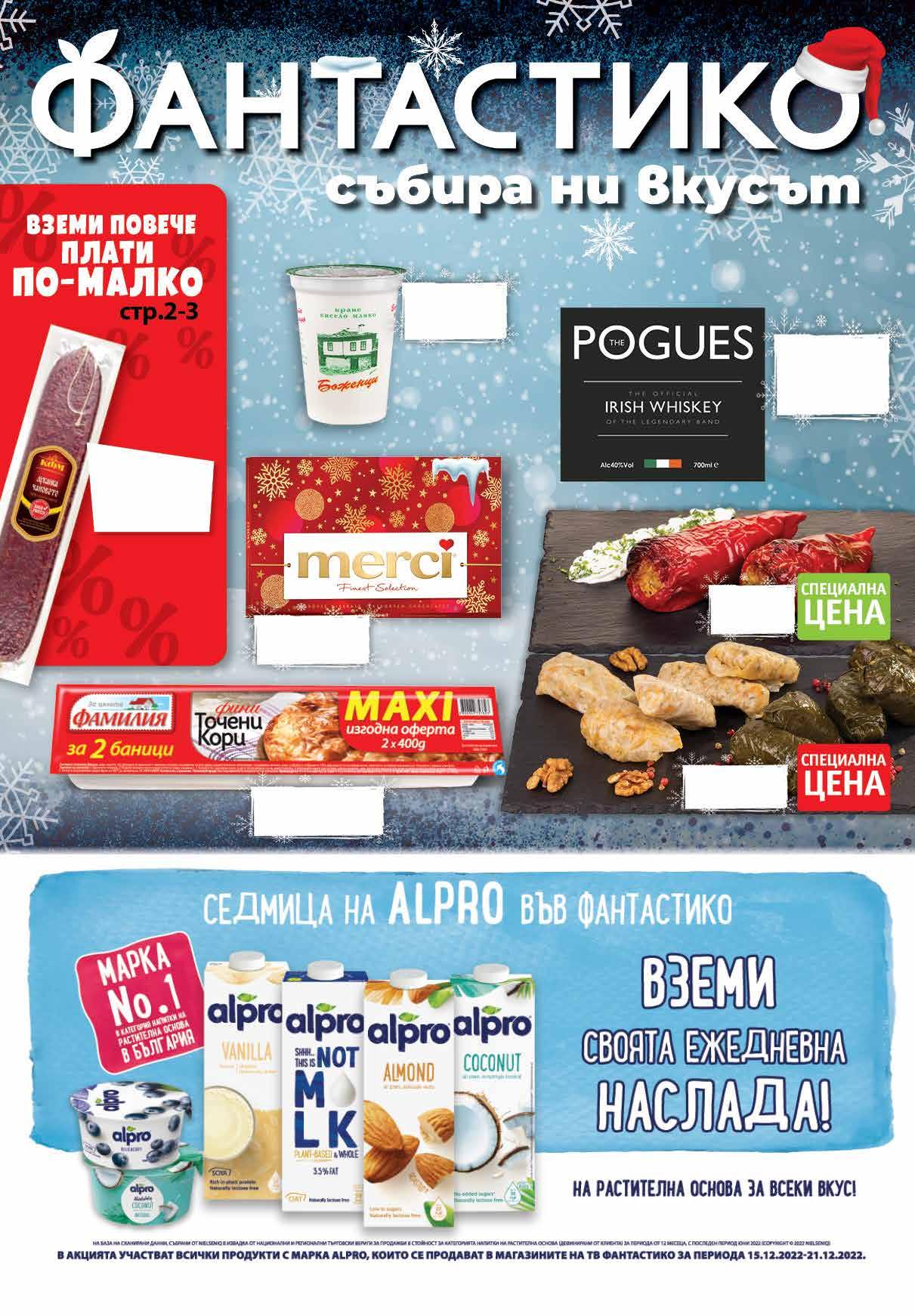 99 лв|бр 18.99 -26% 13 1.79 -22% 1 39 лв|бр * 99 лв|бр 29.99 -33% 19 6.29 -30% 4 39 лв|бр 99 лв|бр 17.99 -27% 12 Пълнени чушки постни Постни сарми зелеви; лозови Кисело мляко БОЖЕНЦИ масленост 4% 400 г Ирландско уиски POGUES Classic 700 мл Фини точени кори ФАМИЛИЯ Maxi 2 х 400 г Бонбони MERCI 400 г Луканка Троянска КФМ Чановете XXL вакуум, 500 г *предложението е валидно от 15.12 до 24.12.2022 г. * www.fantastico.bg fantastico.stores ОФЕРТА ЗА ПЕРИОДА от 15 .12.2022 г. до 22.00 ч . на 21.12.2022 г.