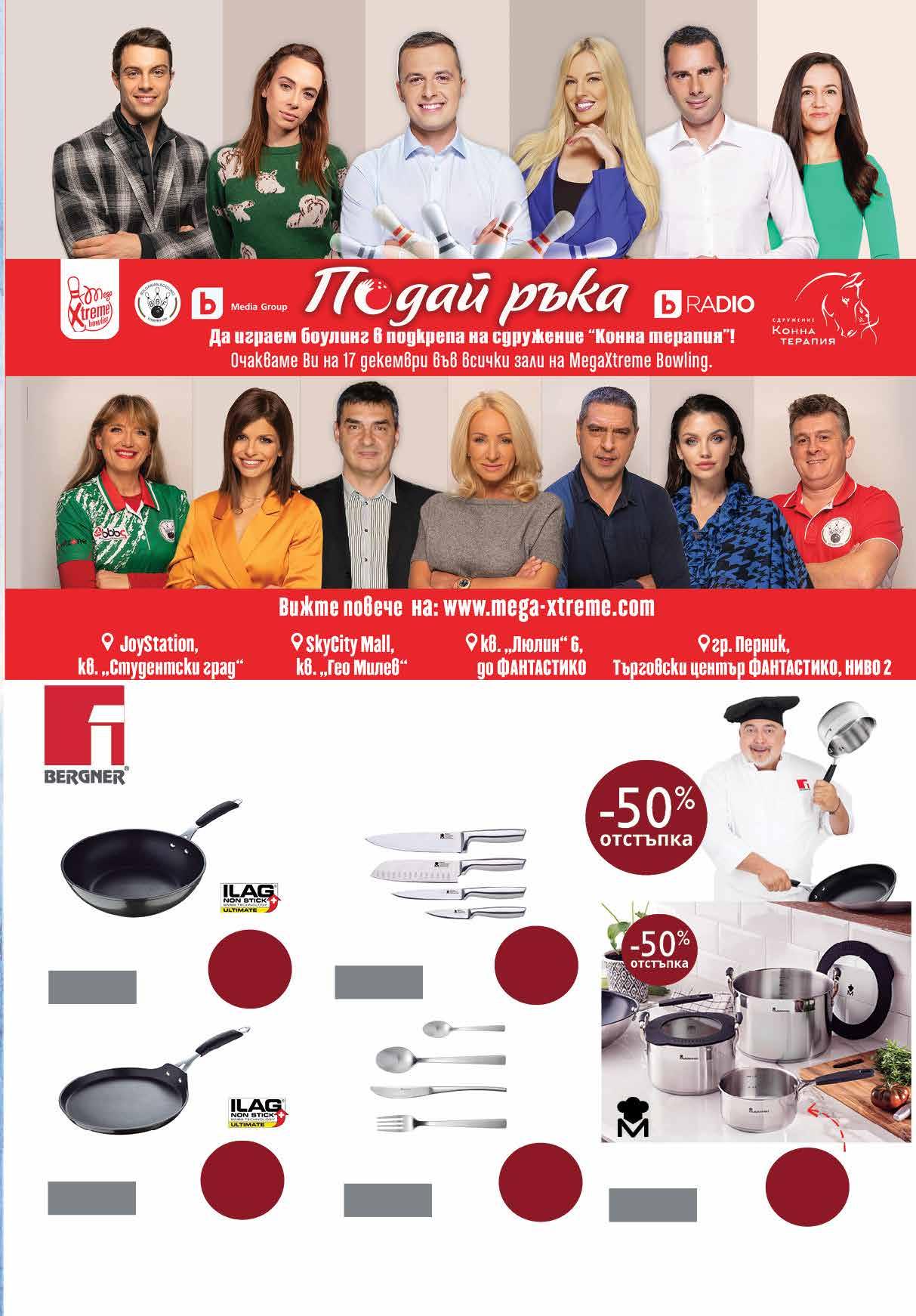 ФУНКЦИОНАЛНОСТ, КАЧЕСТВО И ДИЗАЙН! ПРЕОТКРИЙ ГОТВАЧА В СЕБЕ СИ! Прибори за хранене 24 броя Masterpro Smart 59,99лв/к-т 119,99лв/к-т редовна цена промо цена с 5 точки Уок тиган 28х8см Bergner Midnight Комплект ножове 4 части Masterpro Smart 45,99лв/бр 39,99лв/к-т 91,99лв/бр 79,99лв/к-т редовна цена редовна цена промо цена с 5 точки промо цена с 5 точки Тиган за палачинки 24х2см Bergner Midnight 29,99лв/бр промо цена с 5 точки Касерола 16см 1.5л Masterpro Smart 25,99лв/бр промо цена с 5 точки Събирай промоточки при пазаруване във Фантастико от 03.11.2022 г. до 11.01.2023 г. и вземи 50% отстъпка от цената на избрани продукти от сериите Smart / Midnight до 18.01.2023 г. При всяко пазаруване в обектите на търговска верига Фантастико за всеки 10 лв. от Вашата покупка ще получавате на касата по 1 промо точка (10 лв. = 1 точка; 20 лв. = 2 точки; 30 лв. = 3 точки и т.н.) Залепете получените промо точки на обозначеното в паспорта място. Всички цени са за един брой. 51,99лв/бр редовна цена 59,99лв/бр редовна цена 23 ТВ „Фантастико” не носи отговорност за допуснати печатни грешки. Количествата са лимитирани! Предложенията са валидни до сряда 22.00ч. на 21.12.2022 г.