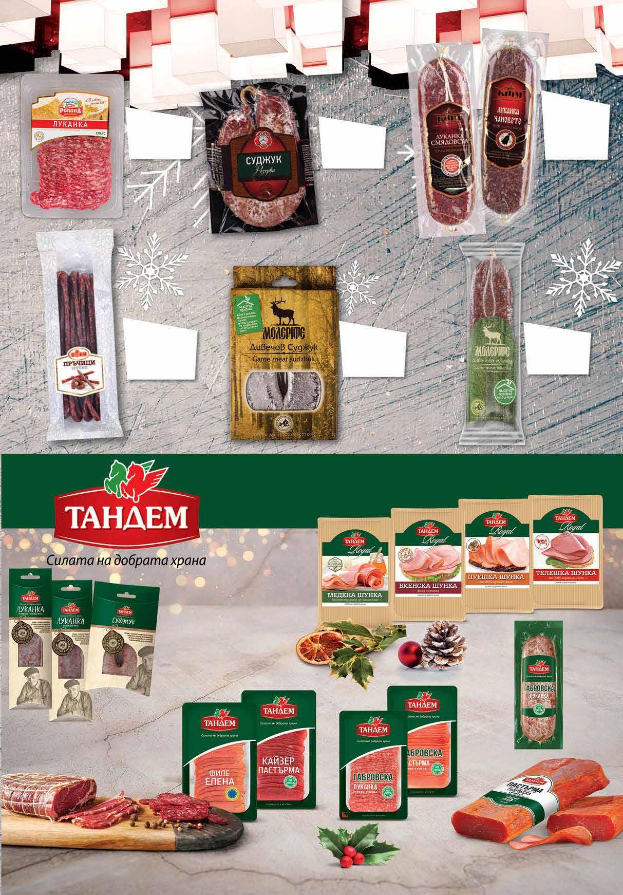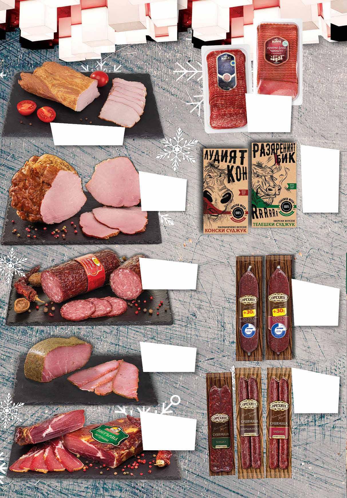 7.69 -22% 5 99 лв|бр 4.99 -30% 3 49 лв|бр 99 лв|кг 62.99 -36% 39 99 лв|кг 62.99 -36% 39 6.69 -25% 4 99 лв|бр Луканка Родопа ЕКО МЕС слайс, 90 г 7.79 -25% 5 79 лв|бр 8.99 -33% 5 99 лв|бр 9.49 -26% 6 99 лв|бр кайзер 7.79 -23% 5 99 лв|бр медена 7.79 -23% 5 99 лв|бр телешка 7.79 -23% 5 99 лв|бр виенска 7.79 -23% 5 99 лв|бр пуешка 7.49 -26% 5 49 лв|бр елена 7.49 -20% 5 99 лв|бр 9.39 -25% 6 99 лв|бр 10.49 -23% 7 99 лв|бр 11.49 -30% 7 99 лв|бр тел. луканка 11.49 -30% 7 99 лв|бр луканка Шунка Royal ТАНДЕМ слайс, вакуум пуешка 150 г; медена; виенска; телешка 180 г Филе ЕЛЕНА слайс 80 г; Пастърма КАЙЗЕР слайс 80 г Суджук Резерва вакуум,170 г ЕЛИТ МЕС Свинска пастърма Габровска; Луканка Габровска ТАНДЕМ слайс, 130 г Луканка Габровска ТАНДЕМ вакуум, 160 г Суджук МОЛЕРИТЕ дивечов вакуум, 170 г Пръчици бирени БОНИ опаковка, 280 г МК ЛОВЕЧ Дивечова луканка МОЛЕРИТЕ вакуум, 170 г Луканка Смядовска; Чановете КФМ вакуум, 170 г Свинска пастърма Габровска насипна от щандова витрина Луканка от свинско и говеждо месо 170 г; Телешки суджук 160 г; Телешка луканка 160 г Майстор в занаята ТАНДЕМ вакуум Роле МАЙСТОР В ЗАНАЯТА насипно от щандова витрина 9 ТВ „Фантастико” не носи отговорност за допуснати печатни грешки. Количествата са лимитирани! Предложенията са валидни до сряда 22.00ч. на 04.01.2023 г.