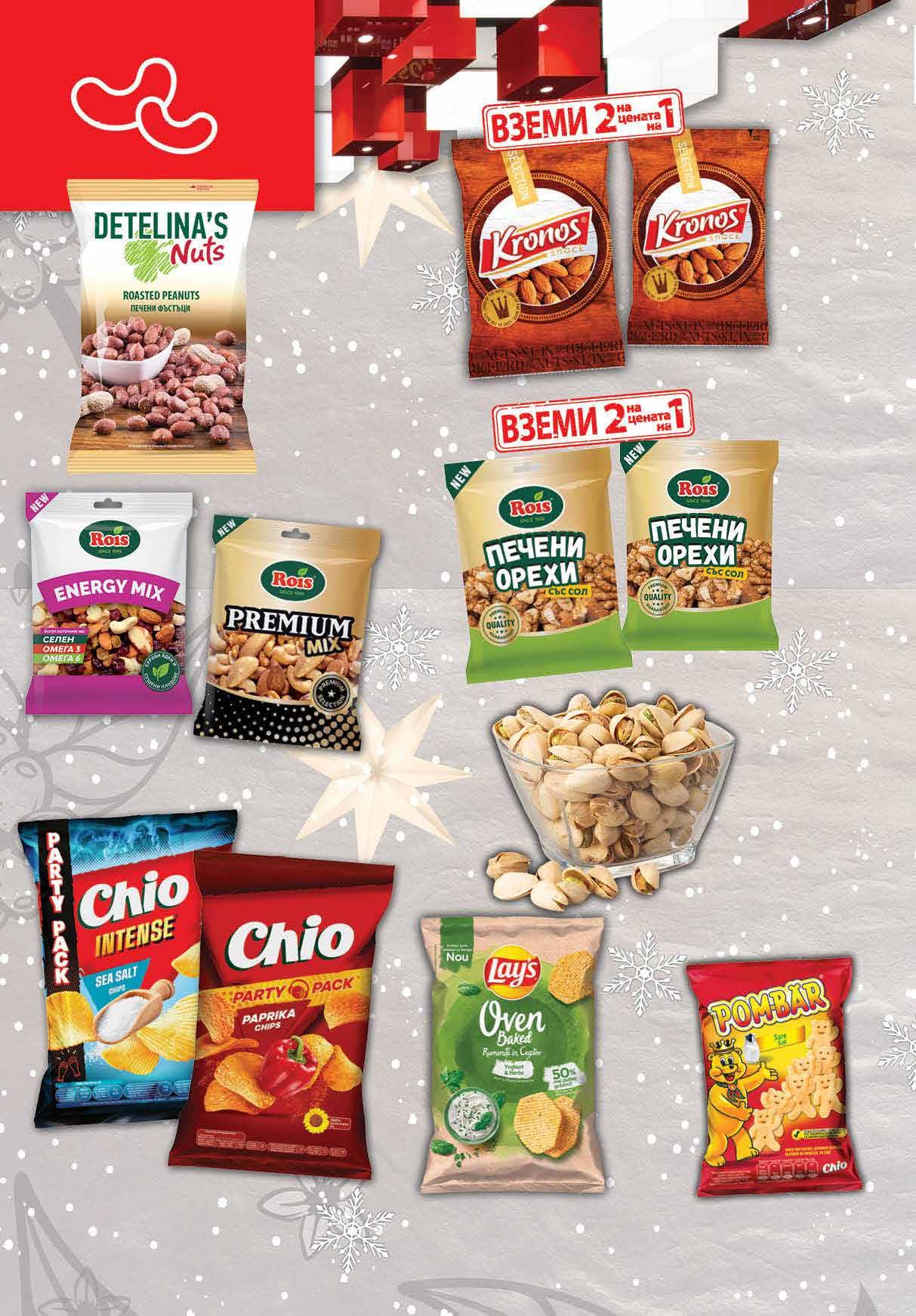 6.49 -30% 4 49 лв|бр energy 4.19 -45% 2 29 лв|бр 99 лв|кг 38.99 -30% 26 3.99 -37% 2 49 лв|бр 4.29 -35% 2 79 лв|бр белени 7.49 -30% 5 19 лв|бр premium 14.56 -50% 7 28 лв|2 бр 9.56 -50% 4 78 лв|2 бр 2.65 -55% 1 19 лв|бр 6.49 -49% 3 29 лв|бр 6.49 -49% 3 29 лв|бр intense Печени орехи със сол ROIS 2 бр х 120 г Снакс POM-BAR различни вкусове 50 г Печени фъстъци DETELINA‘S два вида 350 г Ядки микс ROIS печени Premium 150 г; сурови Energy 150 г Печени бадем KRONOS 2 бр х 130 г Печен чипс LAY`S различни вкусове 125 г Печен шамфъстък* насипен *не се предлага във супермаркет жк. Хаджи Димитър, ул. Макгахан №81 Чипс CHIO различни вкусове 255 г; Чипс CHIO Intense сметана и билки; морска сол 240 г 24 Продуктите се продават в количества, обичайни за едно домакинство. Декорацията към продуктите не е включена в тяхната цена. ТВ „Фантастико“ си запазва правото на промяна в цените.