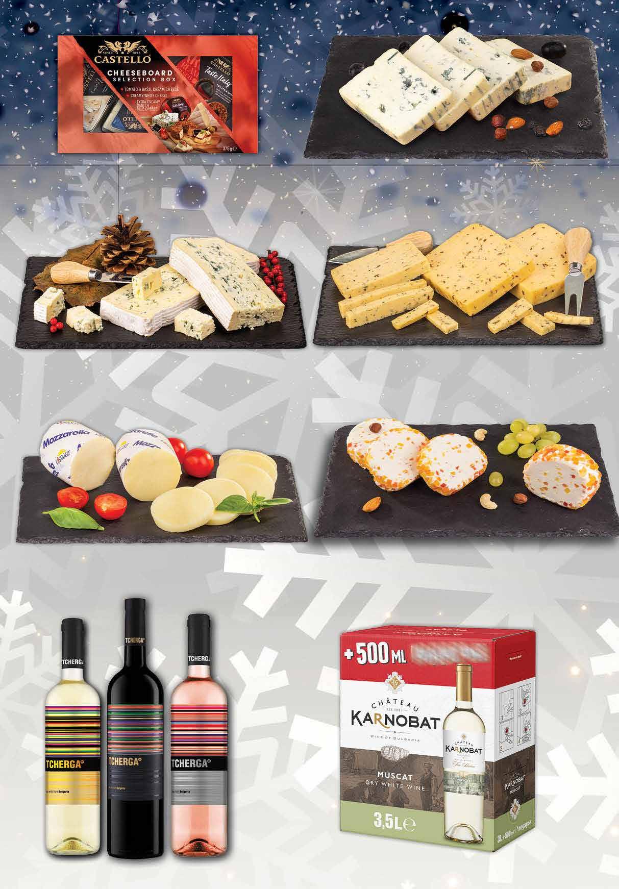 99 лв|бр 23.99 -25% 17 99 лв|бр 24.99 -28% 17 99 лв|бр 17.99 -27% 12 99 лв|бр 15.99 -25% 11 12.89 -38% 7 99 лв|бр 90 лв|бр 34 90 лв|бр 38 90 лв|бр 39 90 лв|бр 34 *Плато сирена 800 г Ементал; Гауда с ким; Гауда пушена; Бри; Чедър; Пушено топено сирене; Прясно сирене смемс; Синьо сирене *Плато микс 800 г Филе Елена; Кайзерован врат; Луканка; Пушено топено сирене; Сирене: Ементал, Гауда с ким, Бри, Синьо сирене *Плато сухи/ пресни колбаси 800 г Свинска пастърма; Луканка; Салам Амбарица; Свинско филе жарено; Пражка шунка; Пуешко филе; Бекон *Плато сухи колбаси 700 г Филе Елена; Свинска пастърма; Кайзерован врат; Роле; Бански старец Луканка; Салам Амбарица *Минималният срок за изпълнение на поръчка на плата е 24 часа. Пенливо вино ARGEO Просеко произход Италия 750 мл Пенливо вино KATARZYNA Brut 750 мл Вино Совиньон Блан FERNLANDS MARLBOROUGH 750 мл Вино ЗЛАТЕН РОЖЕН различни видове 750 мл Вино KORTEN NATURA различни видове 750 мл 16 Продуктите се продават в количества, обичайни за едно домакинство. Декорацията към продуктите не е включена в тяхната цена. ТВ „Фантастико“ си запазва правото на промяна в цените.