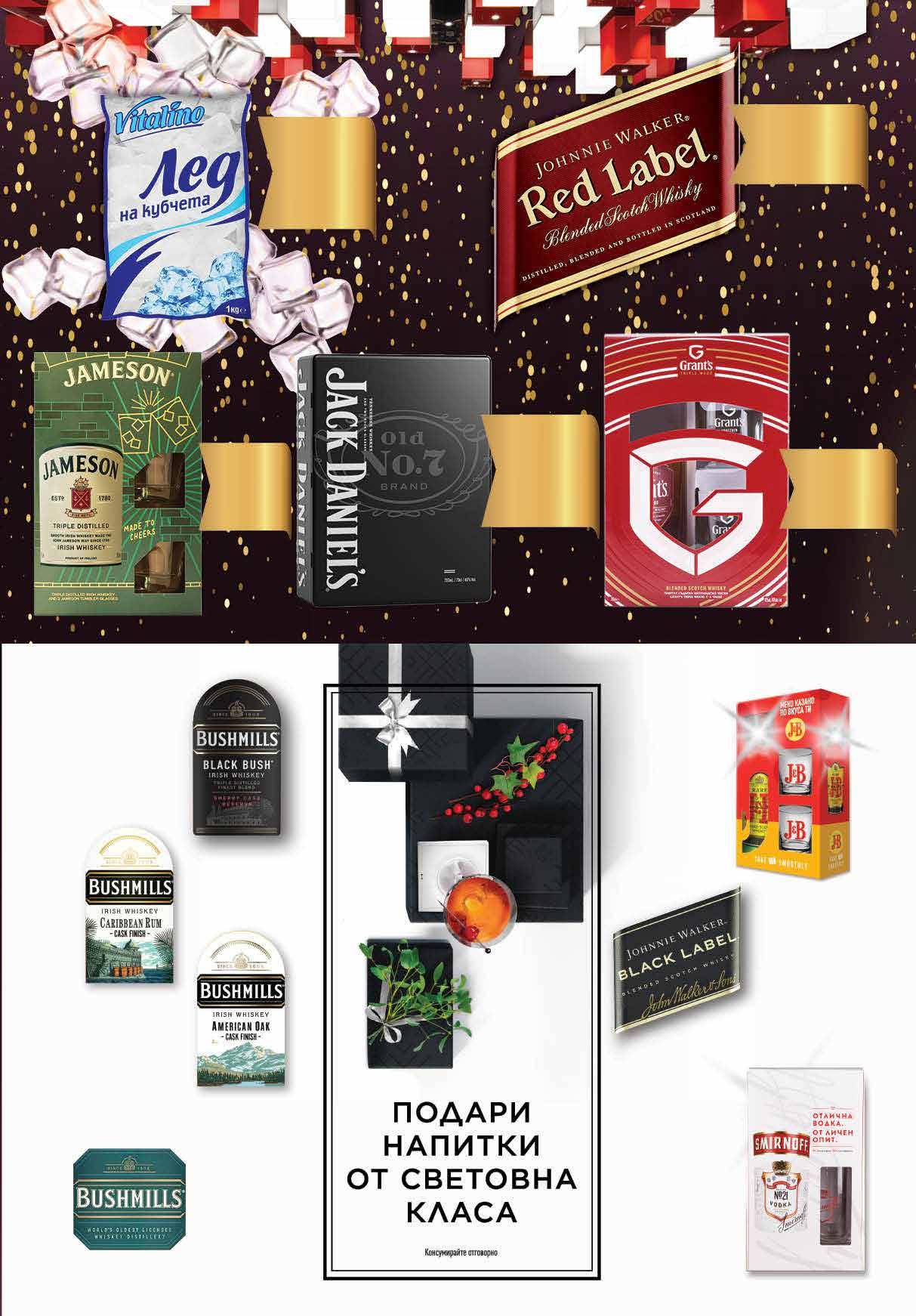 99 лв|бр 40.99 -26% 29 99 лв|бр 49.99 -22% 38 99 лв|бр 26.99 -29% 18 99 лв|бр 21.99 -31% 14 99 лв|бр 29.99 -33% 19 99 лв|бр 49.99 -18% 40 99 лв|бр 51.99 -23% 39 99 лв|бр 39.99 -40% 23 99 лв|бр 27.49 -30% 18 99 лв|бр cask finish 36.99 -29% 25 1.59 -25% 1 19 лв|бр Лед на кубчета VITALINO пакет, 1 кг Ирландско уиски BUSHMILLS Black Bush 700 мл Шотландско уиски J&B 700 мл + 2 ниски чаши Ирландско уиски BUSHMILLS Caribbean Rum Cask finish; American Oak Cask finish 700 мл Ирландско уиски JAMESON 700 мл + 2 чаши Уиски JACK DANIEL‘S метална кутия 700 мл + 2 ниски чаши Шотландско уиски GRANT`S 700 мл + 2 чаши Шотландско уиски JOHNNIE WALKER Red Label 700 мл Ирландско уиски BUSHMILLS Single Malt 10-годишно 700 мл Водка SMIRNOFF №21 700 мл + 1 чаша Шотландско уиски JOHNNIE WALKER Black Label 700 мл 19 ТВ „Фантастико” не носи отговорност за допуснати печатни грешки. Количествата са лимитирани! Предложенията са валидни до сряда 22.00ч. на 04.01.2023 г.