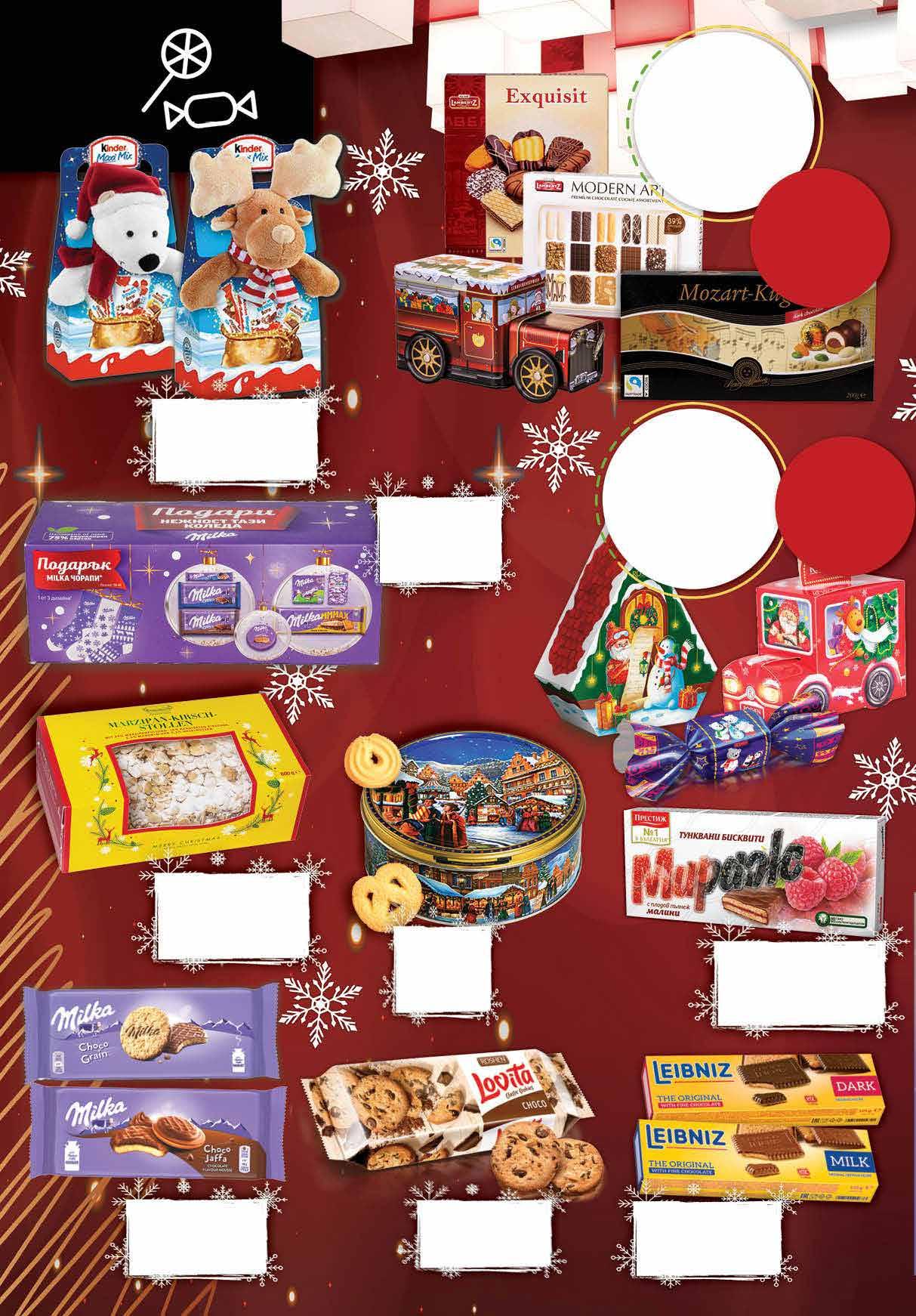 99 лв|бр 18.99 -31% 12 99 лв|бр 23.99 -33% 15 99 лв|к-т 22.59 -29% 15 5.99 -36% 3 79 лв|бр 2.99 -33% 1 99 лв|бр 3.79 -26% 2 79 лв|бр 2.29 -21% 1 79 лв|бр 2.99 -33% 1 99 лв|бр Коледни лакомства микс* MILKA с чорап 653 г *количествата са лимитирани Щолен* с марципан, череши, лешници и бадеми KUCHENMEISTER 600 г *количествата са лимитирани Комплект* KINDER Maxi Mix десерти 133 г + играчка *количествата са лимитирани *предложението е валидно за магазините със сини цени. Количествата са лимимитирани. *предложението е валидно за магазините със зелени цени. Количествата са лимимитирани. Всички продукти с марка LAMBERTZ с Коледни изкушения с марка RОSHEN с ОТСТЪПКА ОТСТЪПКА -30% -35% Датски бисквити КОЛЕДЕН БАЗАР 150 г Бисквити MILKA Choco Grain 126 г; Choco Minis 150 г; Choco Cow 120 г; Choco Sticks 112 г Choco Jaffa128-147 г Бисквити BAHLSEN 100 -125 г; LEIBNIZ KEKS 190г различни видове Бисквити ROSHEN Lovita различни видове 150 г Тунквани бисквити МИРАЖ различни видове 200 г 20 Продуктите се продават в количества, обичайни за едно домакинство. Декорацията към продуктите не е включена в тяхната цена. ТВ „Фантастико“ си запазва правото на промяна в цените.