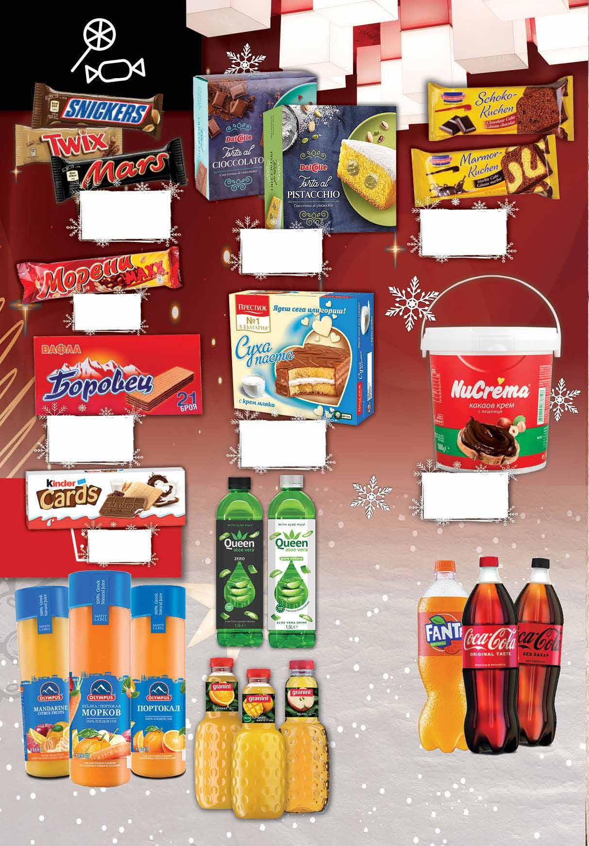 5.49 -27% 3 99 лв|бр 4.79 -22% 3 69 лв|бр 4.29 -37% 2 69 лв|бр 4.69 -36% 2 99 лв|бр сок 2.79 -19% 2 25 лв|БР 5.99 -26% 4 39 лв|бр 0.69 -28% 0 49 лв|бр 9.69 -27% 6 99 лв|бр 4.59 -28% 3 29 лв|бр 6.99 -28% 4 99 лв|бр 9.49 -36% 5 99 лв|бр 1.35 -26% 0 99 лв|бр 5.29 -24% 3 99 лв|бр Сок OLYMPUS различни видове 1 л Газирана напитка COCA-COLA; FANTA; SPRITE различни видове 2 л Напитка QUEEN Алое Вера различни видове PET, 1,5 л Сок/ Нектар GRANINI различни видове 1 л Вафла МОРЕНИ Maxx 49 г Вафла БОРОВЕЦ различни видове 550-630 г Какаов крем NUCREMA различни видове 1 кг Суха паста ПРЕСТИЖ различни видове 300 г Кейк KUCHENMEISTER различни видове 400 г Кейк DAL COLLE различни видове 300 г Десерт TWIX; SNICKERS; MARS различни видове 50 - 51 г Бисквити KINDER Cards 128 г 22 Продуктите се продават в количества, обичайни за едно домакинство. Декорацията към продуктите не е включена в тяхната цена. ТВ „Фантастико“ си запазва правото на промяна в цените.