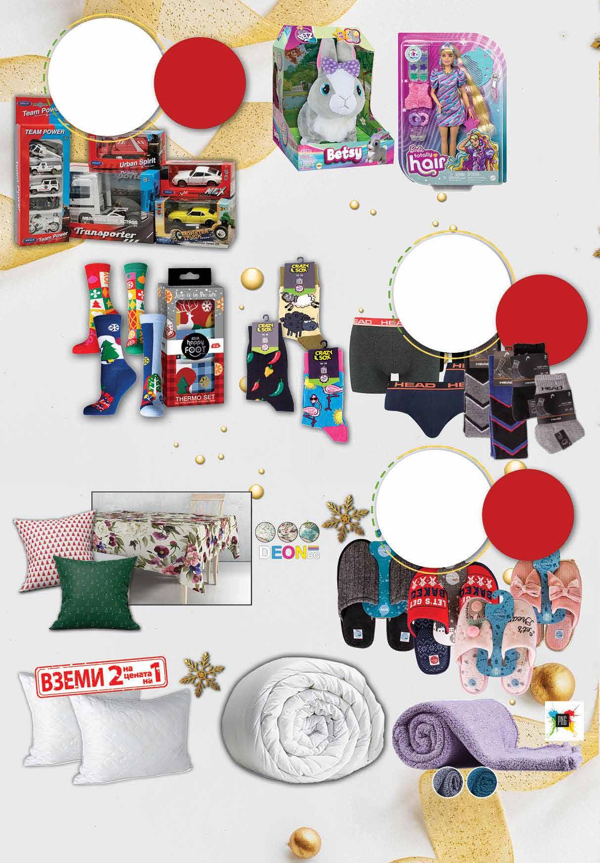 99 лв|к-т 43 99 лв|бр 74 99 лв|бр 150/210 34.99 -22% 26 99 лв|бр 195/210 45.99 -23% 34 98 лв|2 бр 33.96 -50% 16 99 лв|бр 39.99 -30% 27 9.99 -20% 7 99 лв|бр коледа 6.49 -23% 4 99 лв|бр термо 99 лв|к-т 3 чифта 17.99 -22% 13 49 лв|бр 140/180 17 99 лв|бр 100/140 13 7 99 лв|бр калъфка 4 49 лв|бр Комплект кукла Барби с дълга коса и звезди Куклата има изключително дълга коса за игра – цели 21,5 см – и се предлага с над 15 допълнителни части, включително 8 щипки за коса с промяна на цвета, модни аксесоари и допълнителни дрехи. Играчка CLUB PETZ BETSY зайче Бетси реагира на различни звуци, ходи и мърда с уши. Погали я по гърба и чуй колко е доволна. Умалени модели на превозни ОТСТЪПКА -20% *предложението е валидно за магазините със сини цени Вчички пантофи с марка SORBETTO с ОТСТЪПКА -25% Възглавници New Daily 45/65 см, 2 броя Олекотена завивка LANNA микрофибър, 300 г 150/210 см; 195/210 см Одеяло Шерпа меланж PNG 140/200 см лилав, розов, сив, син Чорапи HAPPY FOOT Термо Коледа; Коледа различни видове 1 чифт; Комплект чорапи HAPPY FOOT 3 чифта Покривка 100/140 см; 140/180 см; Калъфка 45/45 см DEON различни видове Чорапи височина над глезена CRAZY SOX дамски № 35-39; мъжки № 40-45 различни видове *предложението е валидно за магазините със сини цени Всички видове мъжко бельо и чорапи с марка с ОТСТЪПКА -20% *предложението е валидно за магазините със сини цени 26 Продуктите се продават в количества, обичайни за едно домакинство. Декорацията към продуктите не е включена в тяхната цена. ТВ „Фантастико“ си запазва правото на промяна в цените.