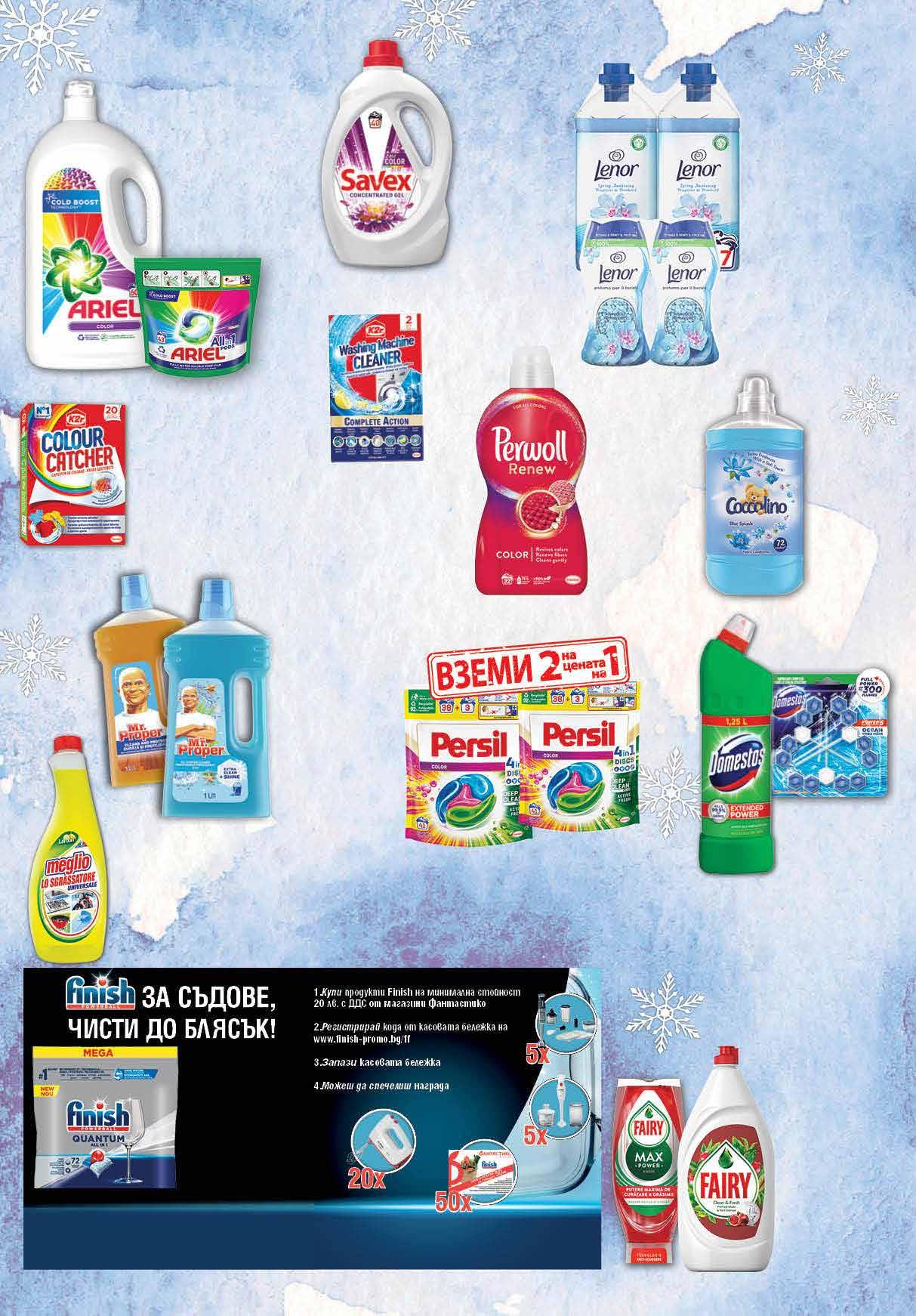 6.98 -47% 3 69 лв|оп. 6.98 -47% 3 69 лв|оп. 99 лв|бр 24 6 99 лв|бр 99 лв|оп. 23 5 69 лв|бр препарат 5 69 лв|к-т 8.99 -33% 5 99 лв|бр 7.49 -20% 5 99 лв|бр 650 мл 4 59 лв|бр за под 5 99 лв|бр дър. пов-ти 99 лв|бр 11 99 лв|k-t омекотител 11 99 лв|k-t перли 11 98 лв|2 oп. 69.96 -50% 34 3 99 лв|бр 9 99 лв|бр Капсули за пране PERSIL Discs 2* оп. х 41 бр в опаковка; Power Caps 2* оп. х 46 бр в опаковка; различни видове *от един и същи вид Препарат за съдове FAIRY МАХ POWER 650 мл; 900 мл 1,2 л различни видове Гел 2,2 л; Прах 4 кг; Капсули 28 бр за пране SAVEX различни видове Таблетки за съдомиялна машина FINISH All in 1, 100 бр; All in Max, 94 бр; Quantum All in 1, 72 бр; Quantum Ultimate 60 бр Препарат DOMESTOS бор; атлантик 1,25 л; Ароматизатор DOMESTOS WC Power комплект 3 бр х 55 г Омекотител 1,68 л; 1,8 л COCCOLINO различни видове Цветоулавящи кърпи за цветно пране COLOUR CATCHER 20 бр в опаковка Препарат за почистване на пералня K2R 2 бр в опаковка Комплект омекотител 2 бр х 1.7 л различни видове Комплект ароматизиращи перли Spring 2 бр x 140 г LENOR Препарат Mr.PROPER за под - лавандула; лимон; океан; цветя; за дървени повърхности 1 л Препарат Renew 1,92 л различни видове; Капсули 19 бр за пране PERWOLL Обезмаслител MEGLIO лимон пълнител 750 мл Организатор на Кампанията е Аксон България АД. Период на Кампанията: 01.12.2022 г. – 02.01.2023 г. Наградите са: 5 броя Вакуумиращ пасатор Bosch MaxoMixx 1000 W, 5 броя Пасатор Bosch CleverMixx 400 W, 20 броя Миксер Bosch ErgoMixx 400 W и 50 Талона на стойност 50 лв. за пазаруване от магазини Фантастико. Повече информация и пълни правила на Кампанията ще откриете на www.finish-promo.bg/ff. Снимките са с илюстративна цел. Гел за пране 3.3 л; Прах за пране 3.9 кг Color; Капсули 43 бр в опаковка различни видове ARIEL за пране *цената е валидна за перода от 22.12. до 04.01.2023г. 30 Продуктите се продават в количества, обичайни за едно домакинство. Декорацията към продуктите не е включена в тяхната цена. ТВ „Фантастико“ си запазва правото на промяна в цените.