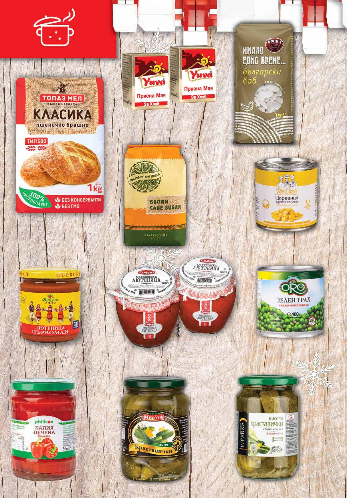 2.99 -26% 2 19 лв|бр 9.49 -26% 6 99 лв|бр 7.59 -34% 4 99 лв|бр 4.69 -23% 3 59 лв|бр 2.49 -20% 1 99 лв|бр 4.19 -21% 3 29 лв|бр 1.69 -23% 1 29 лв|бр 3.99 -20% 3 19 лв|бр 4.29 -23% 3 29 лв|бр 1.25 -28% 0 89 лв|бр 5.99 -20% 4 79 лв|бр Македонска едросмляна лютеница сладка; пикантна 550 г СОФРА Супер сладка царевица THE CHEFS 340 г Капия печена белена PHILICON 545 г Зелен Грах MY ОRО 400 г Пшенично брашно ТОПАЗ МЕЛ Класика тип 500, 1 кг Кафява тръстикова захар SUGARS OF THE WORLD 1 кг Лютеница Първомай BULCONS по БДС, 400 г Кисели краставички PIPERKA 680 г Краставички МИСОТА Мини 3-6 см 720 мл Мая за хляб YUVA прясна 42 г Боб български Имало едно време... 1 кг КРИНА 10 Продуктите се продават в количества, обичайни за едно домакинство. Декорацията към продуктите не е включена в тяхната цена. ТВ „Фантастико“ си запазва правото на промяна в цените.
