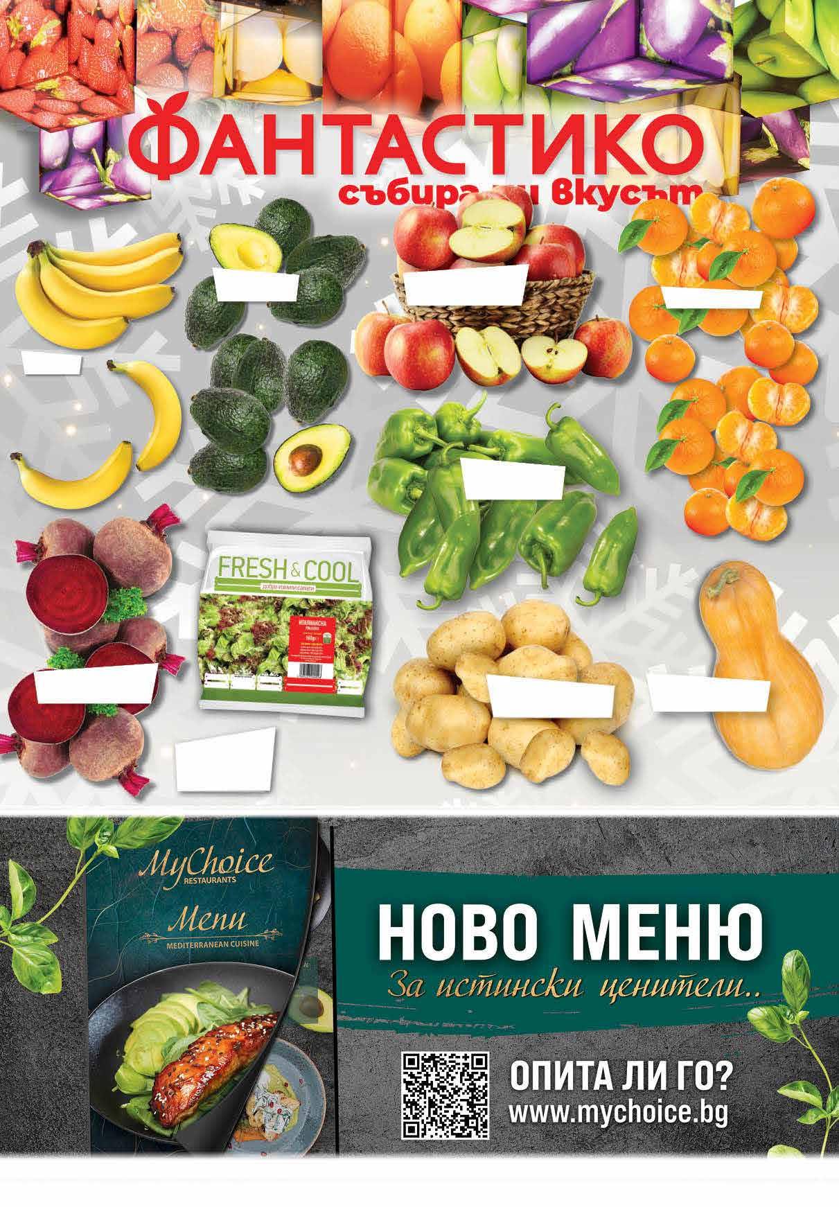 1.39 -35% 0 89 лв|бр 4.29 -23% 3 29 лв|бр 3.49 -42% 1 99 лв|кг 0.99 -30% 0 69 лв|кг 1.69 -29% 1 19 лв|кг 3.99 -25% 2 99 лв|кг 1.59 -37% 0 99 лв|кг 1.49 -33% 0 99 лв|кг 2.49 -24% 1 89 лв|кг Чушки капия зелени Авокадо калибър 26 Шарени ябълки произход България Мити картофи произход Германия Банани Цвекло произход България Мандарини Жълта тиква произход България Салата италианска FRESH & COOL 160 г Продуктите, обозначени с този символ, са с БЪЛГАРСКИ произход. Снимките са с илюстративна цел. ТВ „Фантастико” не носи отговорност за допуснати печатни грешки. Количествата са лимитирани! Предложенията са валидни до сряда 22.00 ч на 04.01.2023 г.