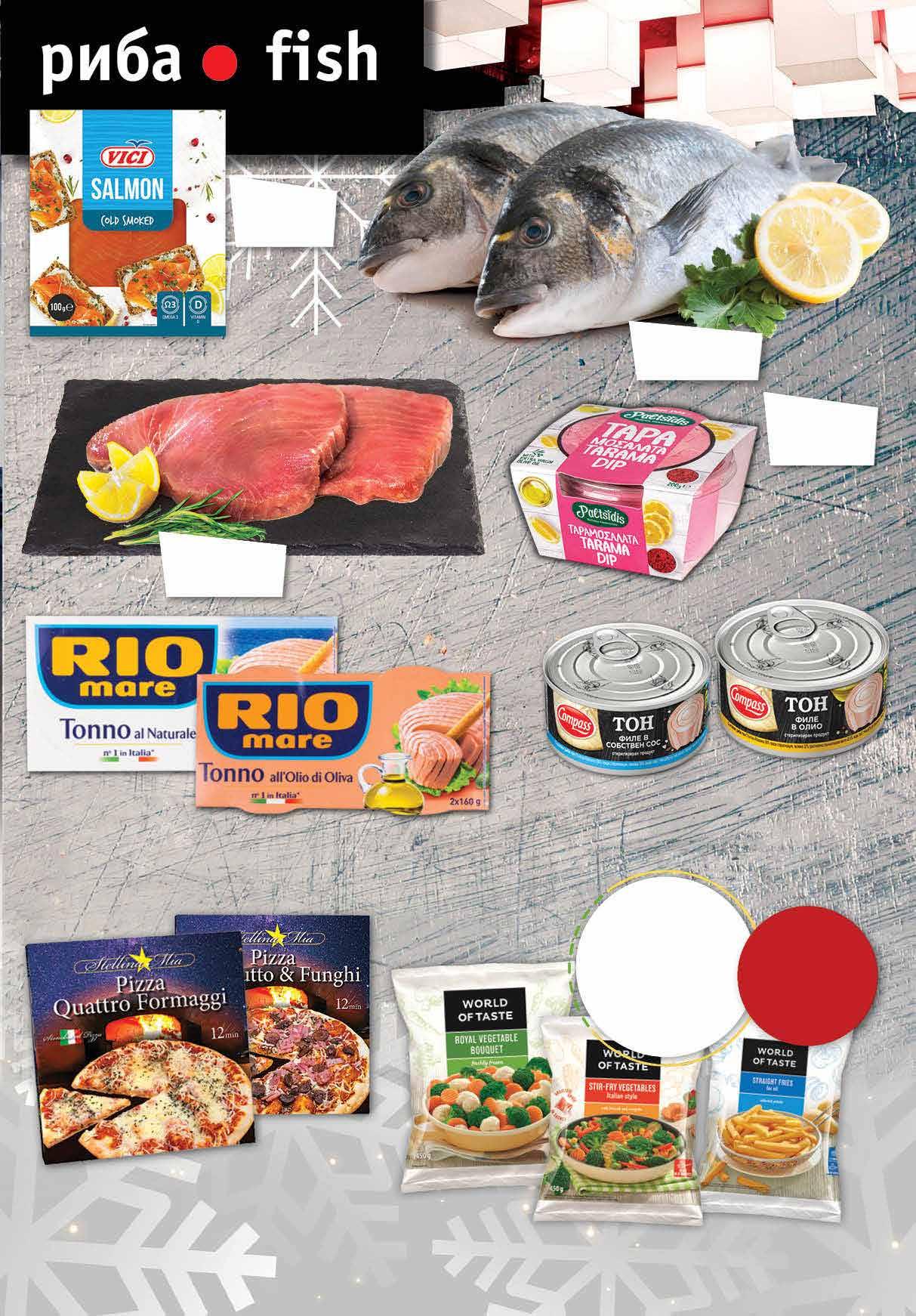 99 лв|oп. 15.99 -25% 11 4.99 -32% 3 39 лв|бр олио 4.99 -32% 3 39 лв|бр соб.сос 4.49 -22% 3 49 лв|бр 9.99 -33% 6 69 лв|бр 99 лв|кг 20.99 -33% 13 99 лв|кг 42.99 -30% 29 Риба тон филе от щандова витрина* 5.99 -20% 4 79 лв|бр Ципура чистена от щандова витрина* Пушено филе от сьомга VICI слайс, 100 г Разбит хайвер PALTSIDIS тарама розова 200 г Риба тон RIO MARE в растително масло; натюр опаковка 2 бр х 160 г Риба тон филе COMPASS В олио; В собствен сос 160 г Пица STELLINA MIA различни видове замразена 340-350 г *предложението е валидно за магазините със сини цени Всички замразени зеленчуци и картофи с марка WORLD OF TASTE с ОТСТЪПКА -30% 5 ТВ „Фантастико” не носи отговорност за допуснати печатни грешки. Количествата са лимитирани! Предложенията са валидни до сряда 22.00ч. на 04.01.2023 г. Продуктите се предлагат в следните филиали: Ф6 район Студентски, бул. Г.М. Димитров №77; Ф7 жк Овча купел 1, ул. Монтевидео №98; Ф11 жк Хаджи Димитър, ул. Васил Кънчев/ул. Баба Вида №29; Ф14 гр. Ботевград, ул. Витоша 1А; Ф16 жк Люлин 6, бул. Джавахарлал Неру №26А; Ф17 жк Надежда 3, бул. Хан Кубрат №26, до бл. 301; Ф18 жк Стрелбище, ул. Нишава №138; Ф19 кв Бояна, бул. Ал. Пушкин №64; Ф21 жк Младост 4, ул. Д-р Атанас Москов №15; Ф22 Студентски град, ул. Акад. Борис Стефанов №22; Ф28 жк Гео Милев, ул. Коста Лулчев №52, в сградата на Sky City Mall; Ф30 кв Драгалевци, бул. Черни връх №204; Ф33 бул. Симеоновско шосе 87А; Ф34 жк Хаджи Димитър, ул. Макгахан №81; Ф36 жк Дървеница, бул. Св. Климент Охридски №15; Ф38 жк Овча купел, ул. Любляна №42А; Ф39 жк Разсадника – Коньовица, ул. Хъшове №4; Ф40 жк Гео Милев, ул. Николай Коперник №27; Ф41 гр. Елин Пелин, ул. Витоша №7; Ф42 жк Младост 1, бул. Йерусалим №22; Ф43 кв. Манастирски ливади, ул. Пирин №51А Ф44 гр. Банкя, кв. Изгрев, ул. Стефан Стамболов №138; Ф45 гр. Перник, ж.к. Изток, ул. Юрий Гагарин №52.